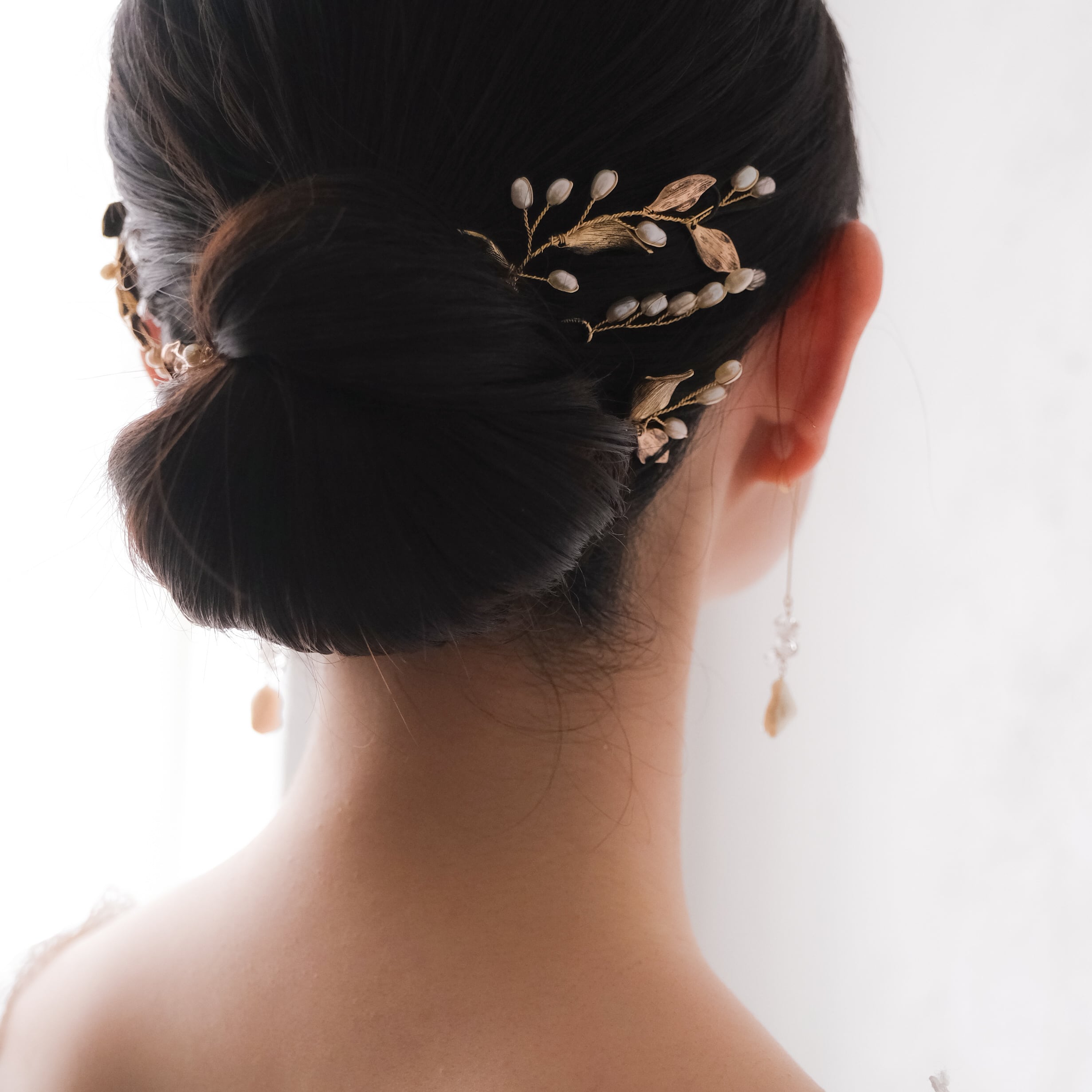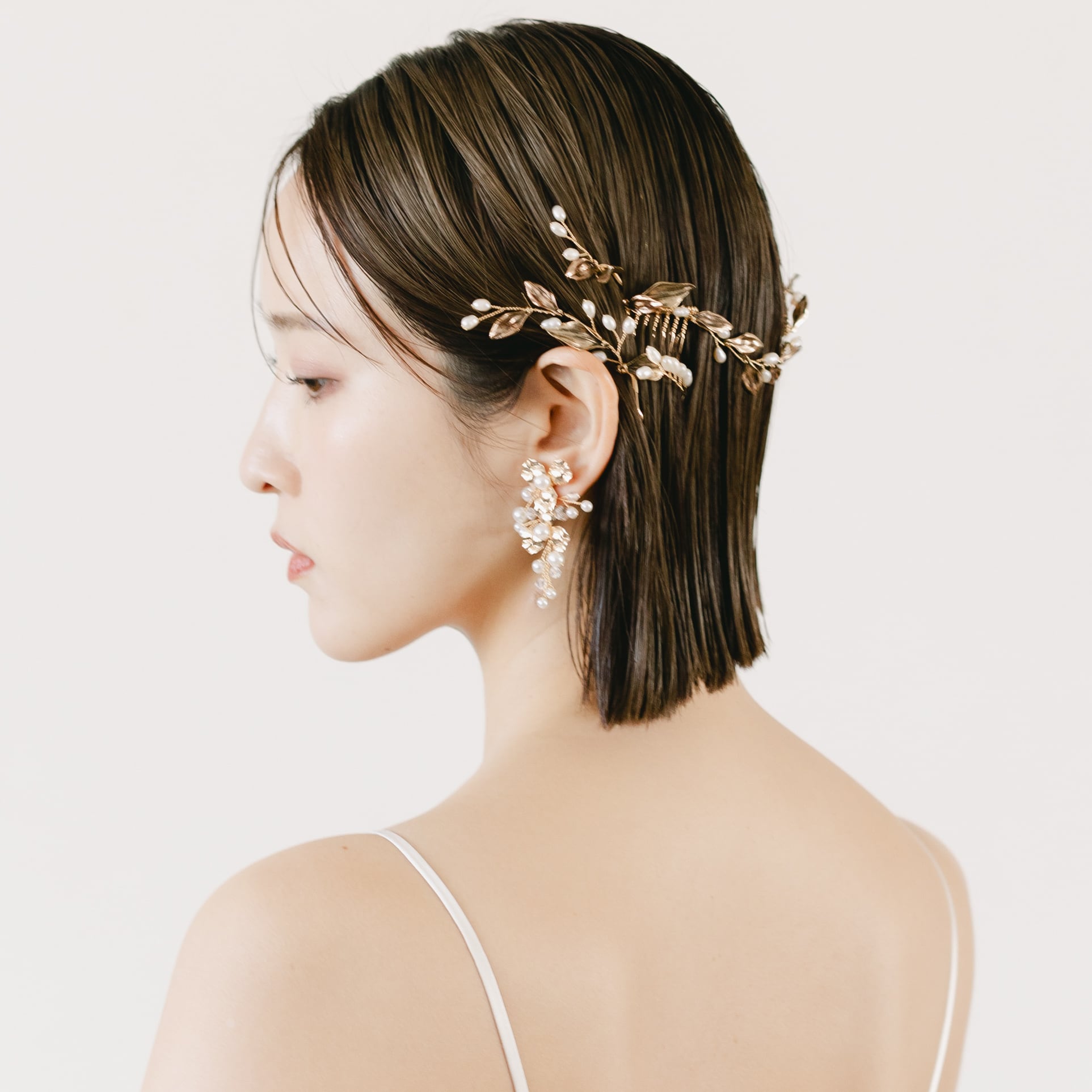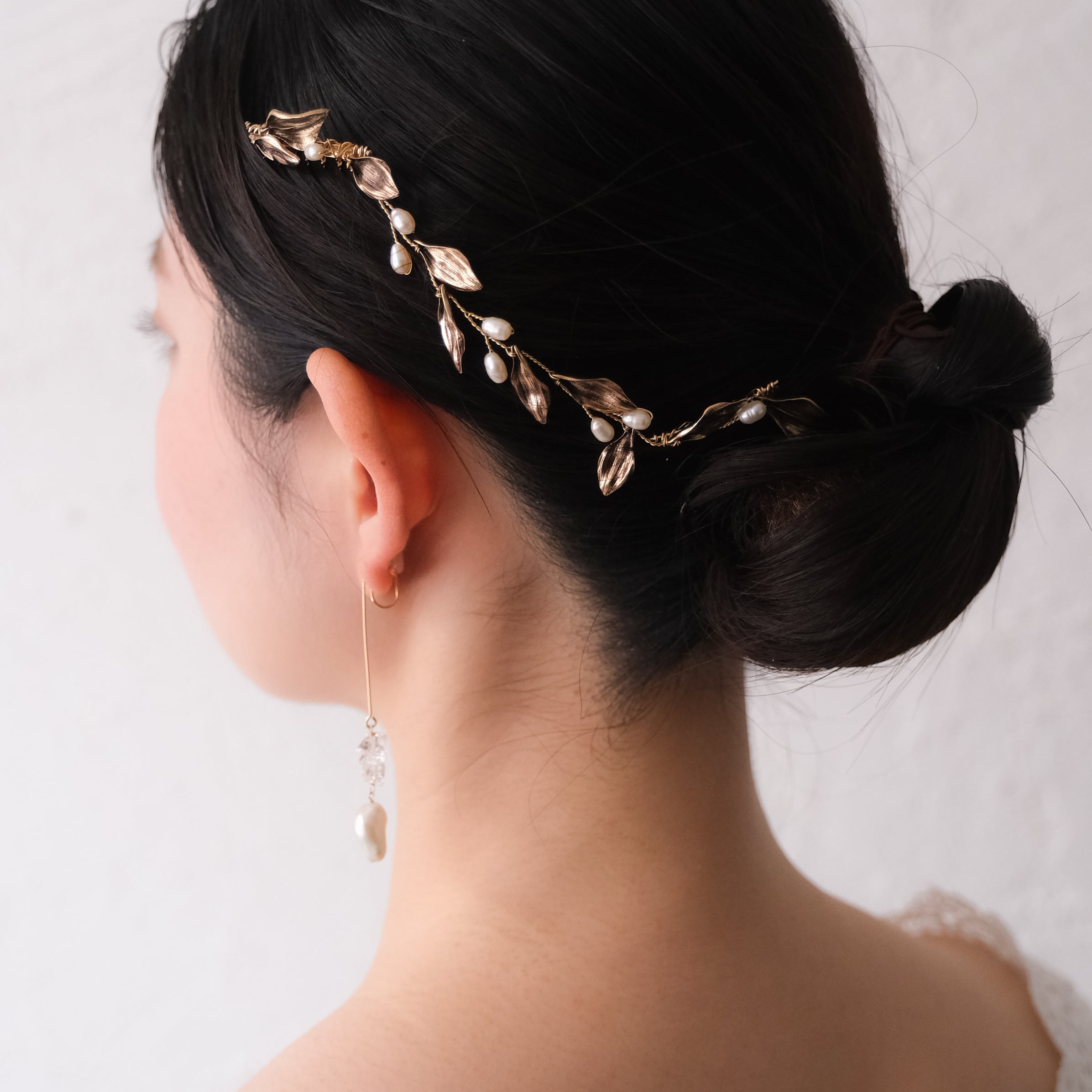 x21-hd142【ヘッドドレス】4点セット リーフ パール ナチュラル ブライダル 褐色ゴールド