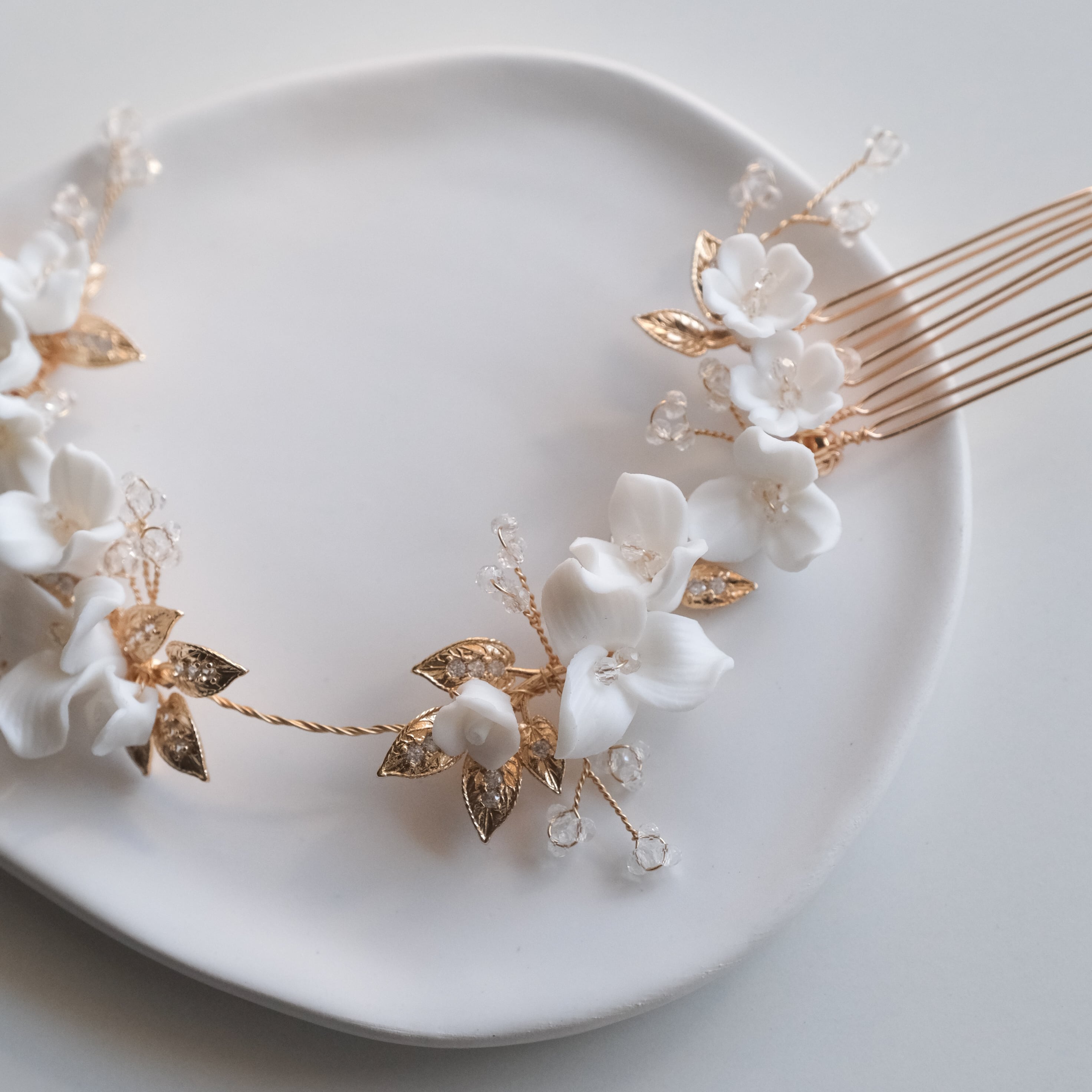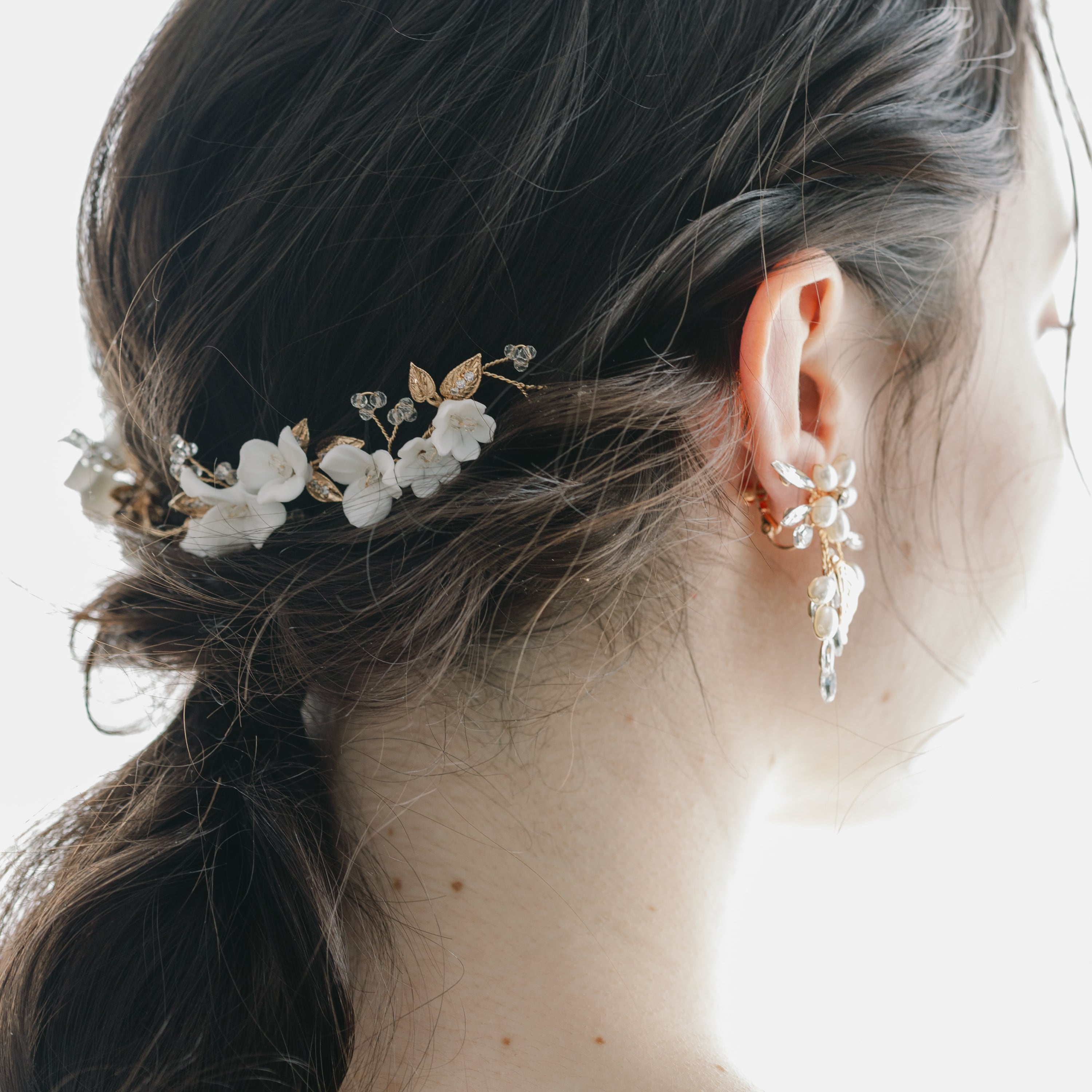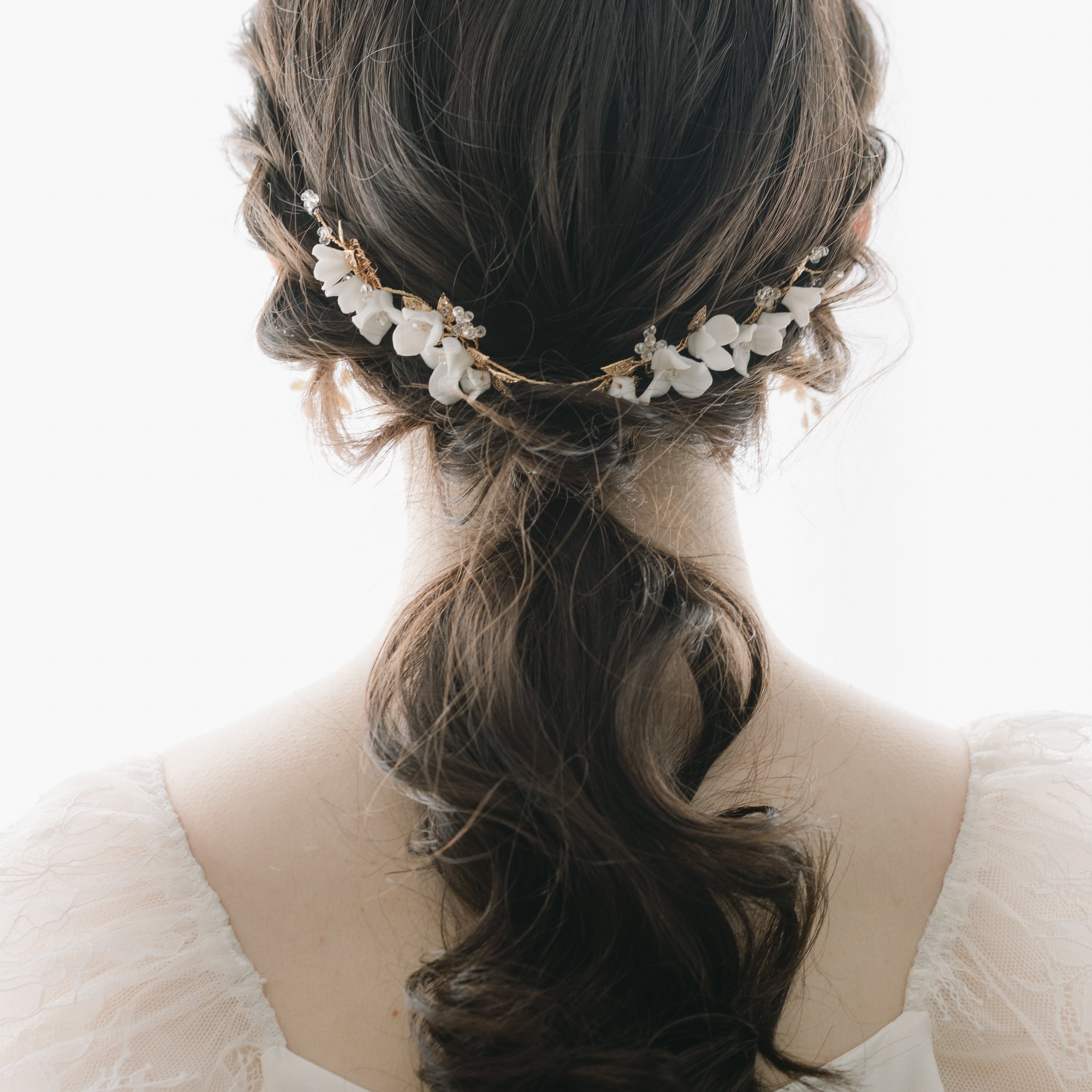セラミック素材で作られたエレガントなホワイトフラワーが、ビジューがついたゴールドの葉っぱのデザインと組み合わさった、特別な日のためのヘッドドレスです。