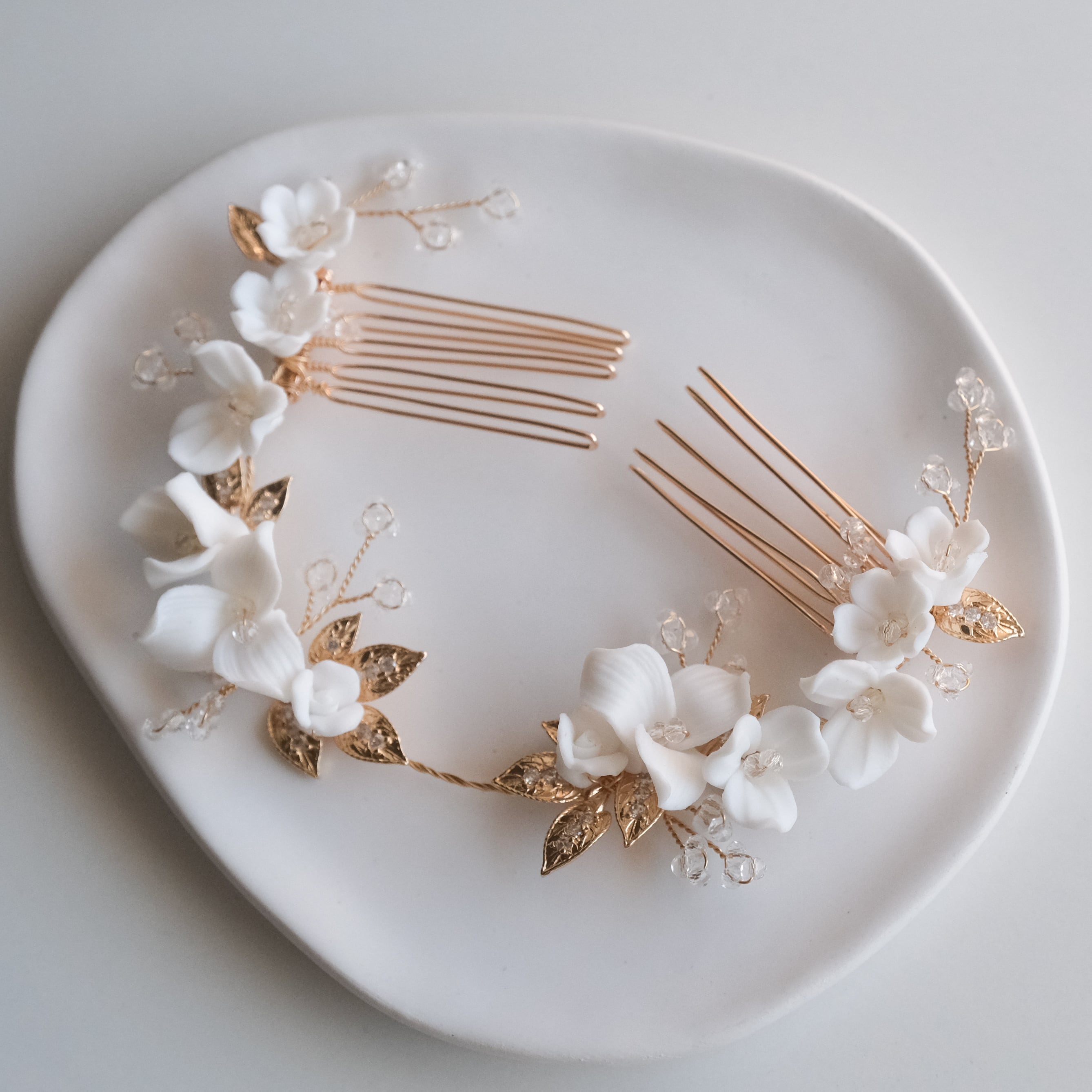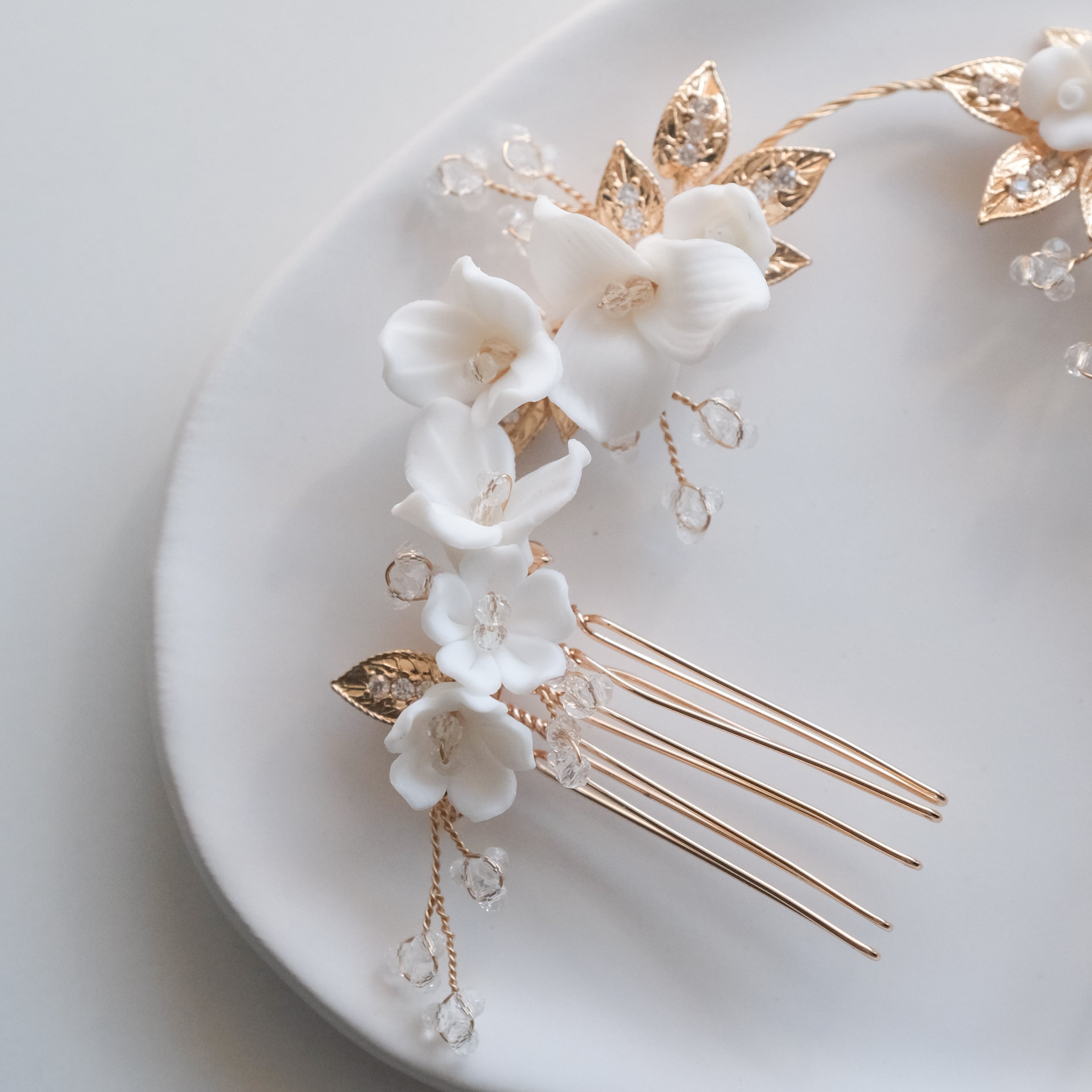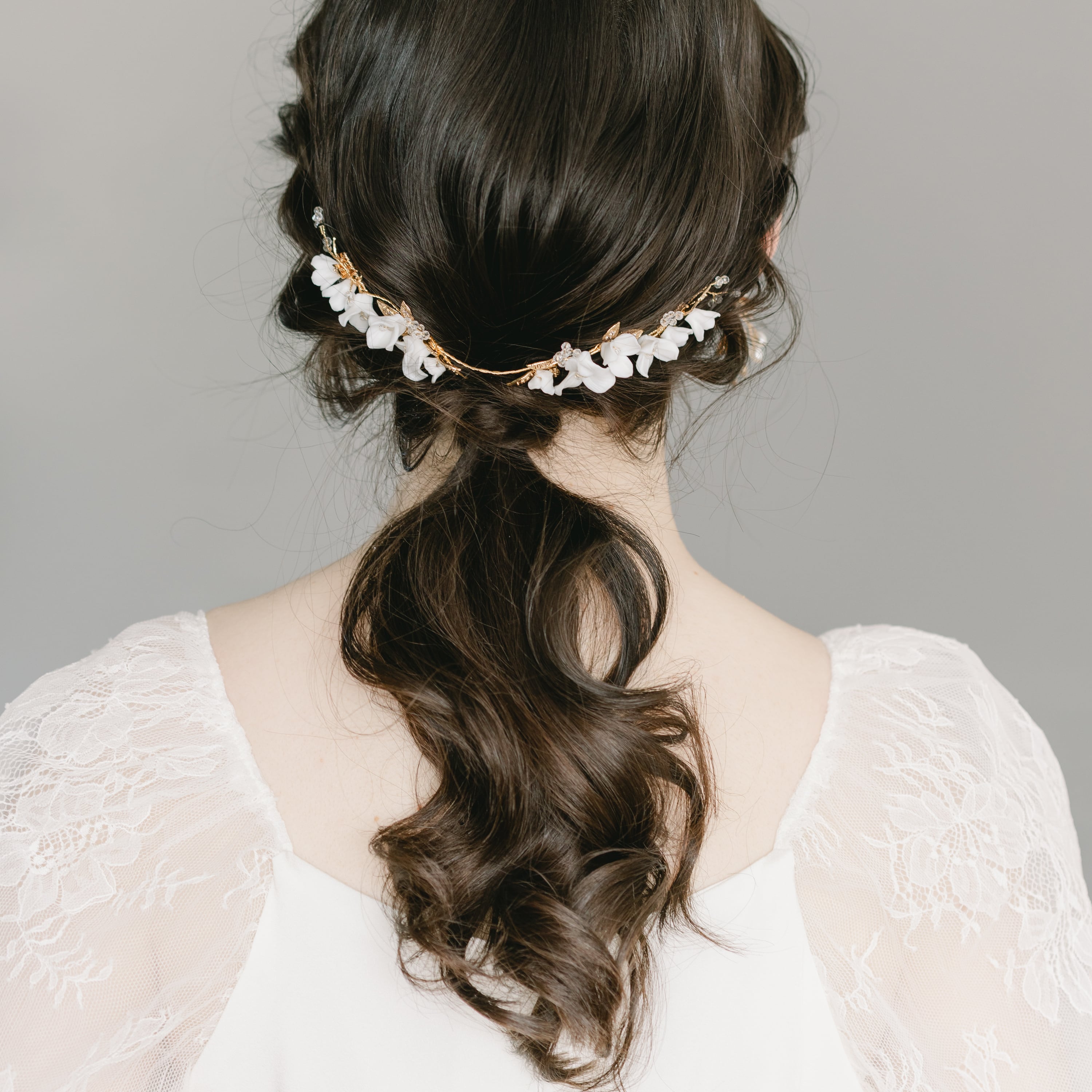 セラミック素材で作られたエレガントなホワイトフラワーが、ビジューがついたゴールドの葉っぱのデザインと組み合わさった、特別な日のためのヘッドドレスです。