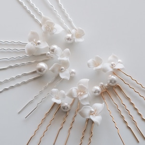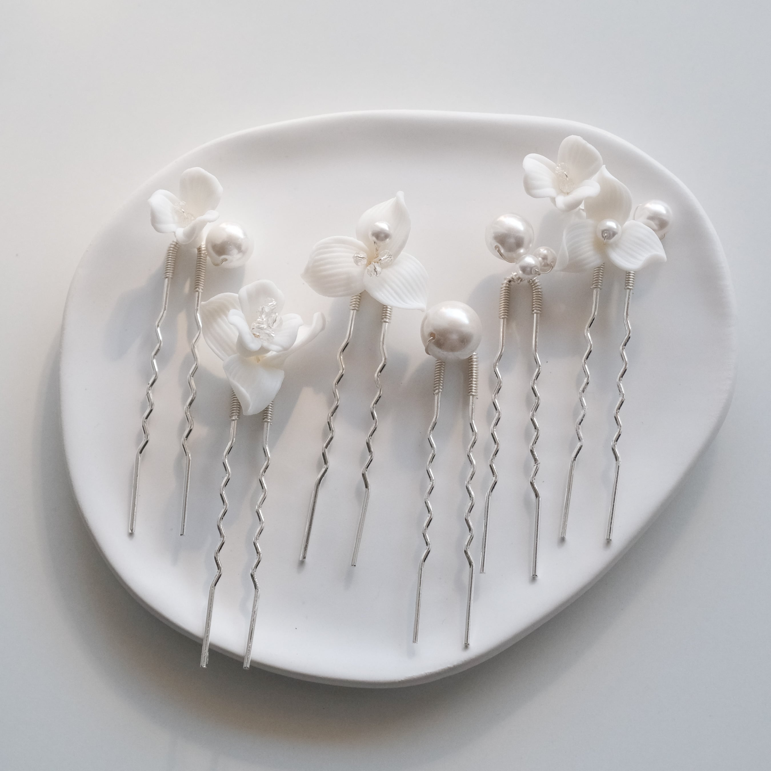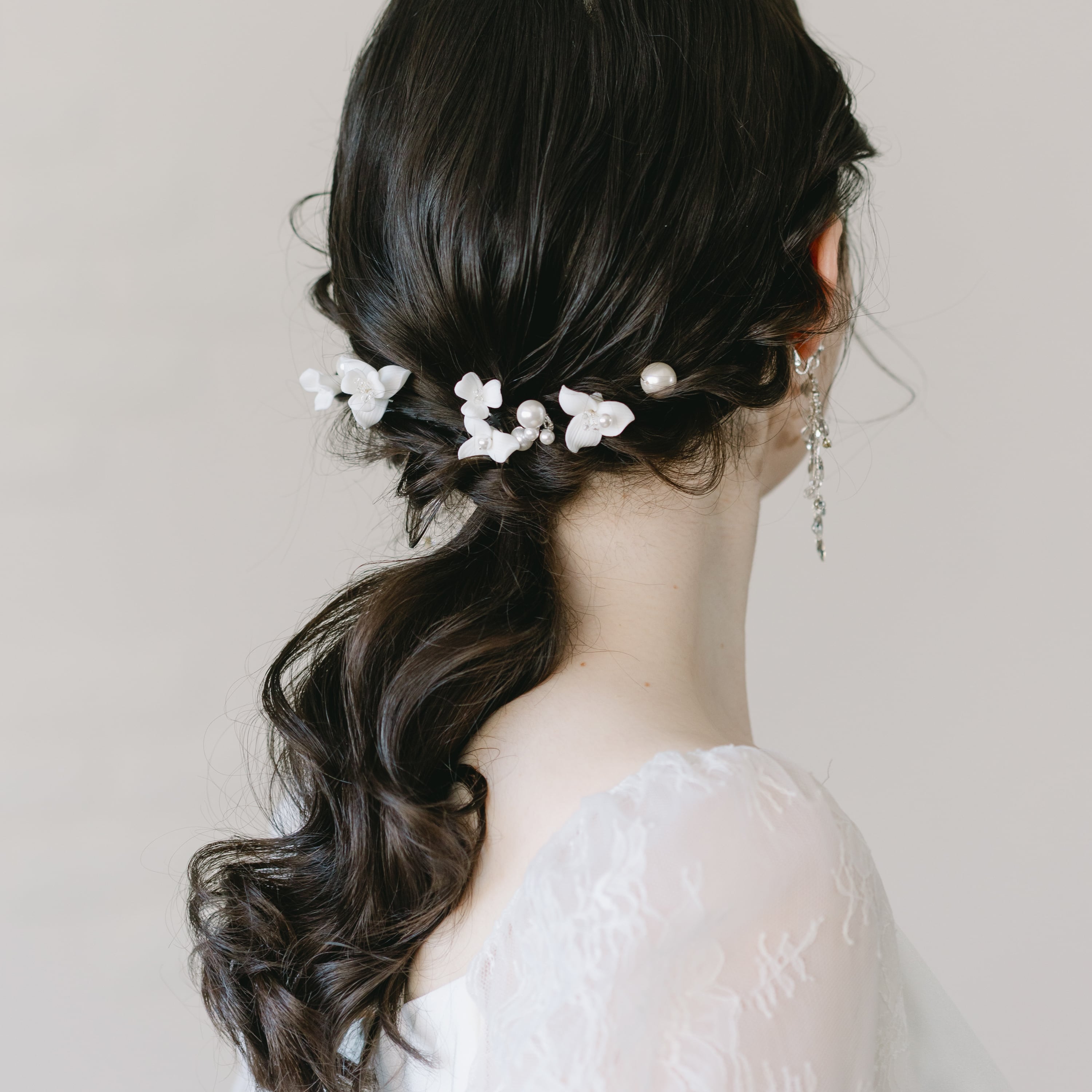 セラミック素材で作られたホワイトフラワーとパールのピンヘッドドレス6点セットです。