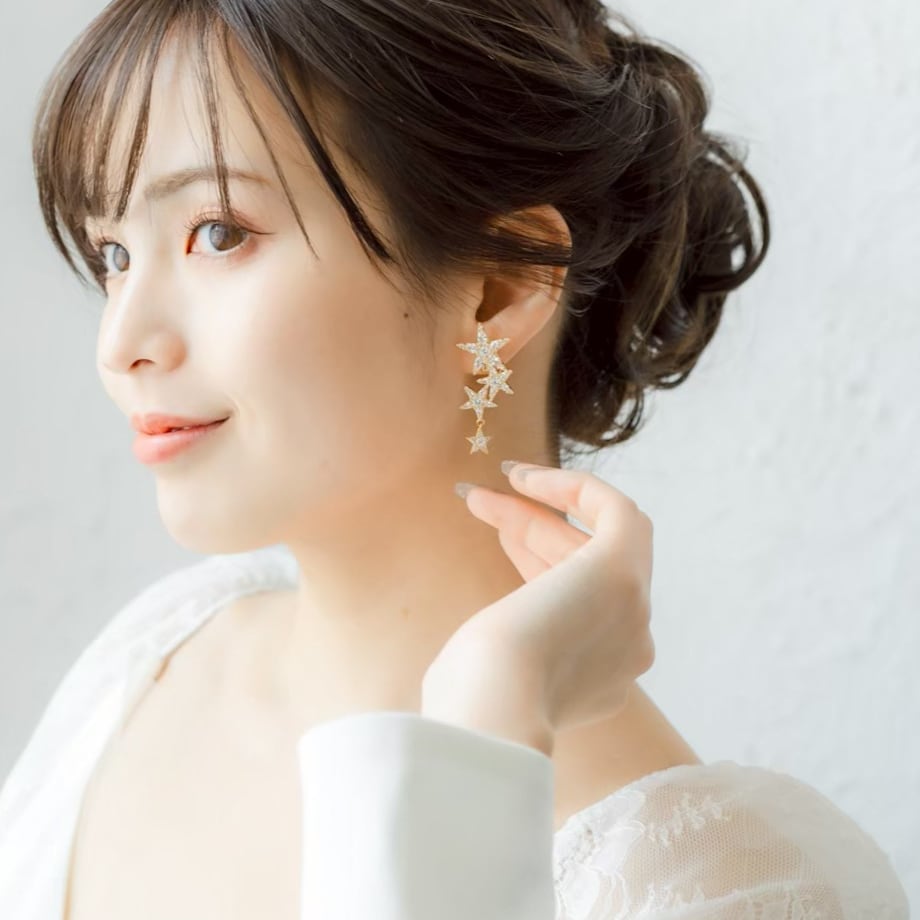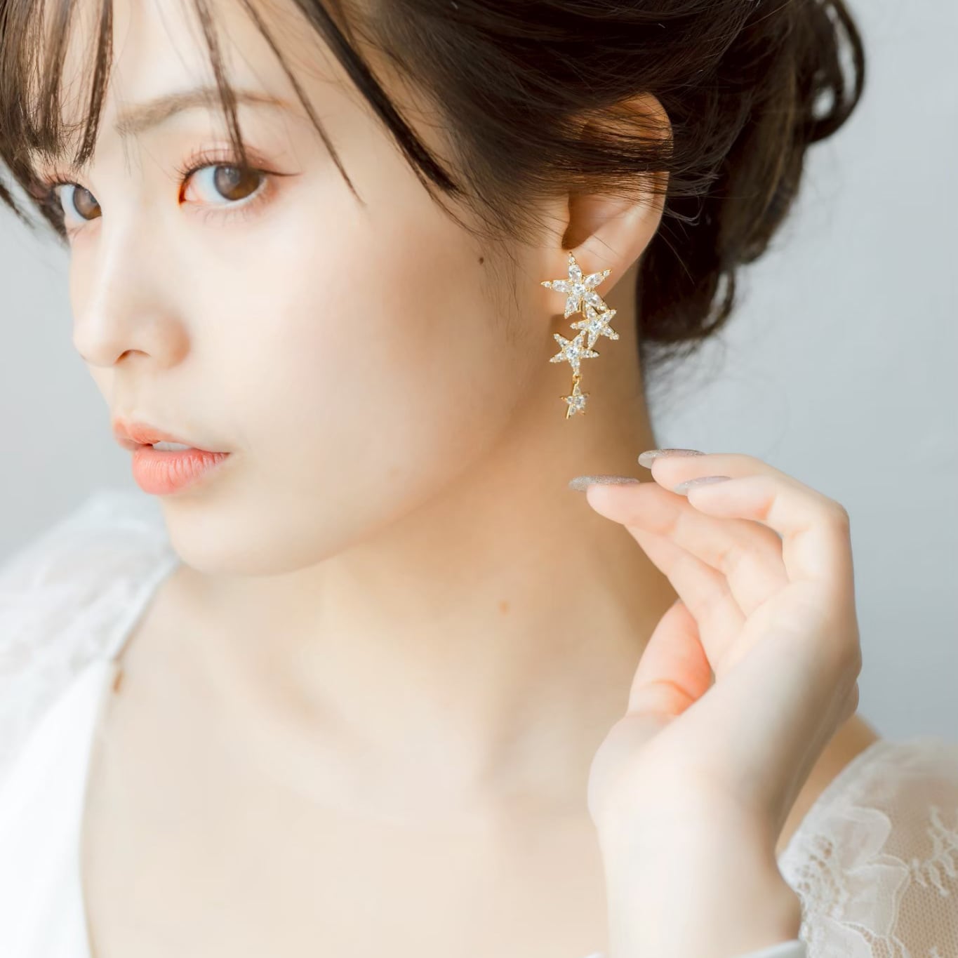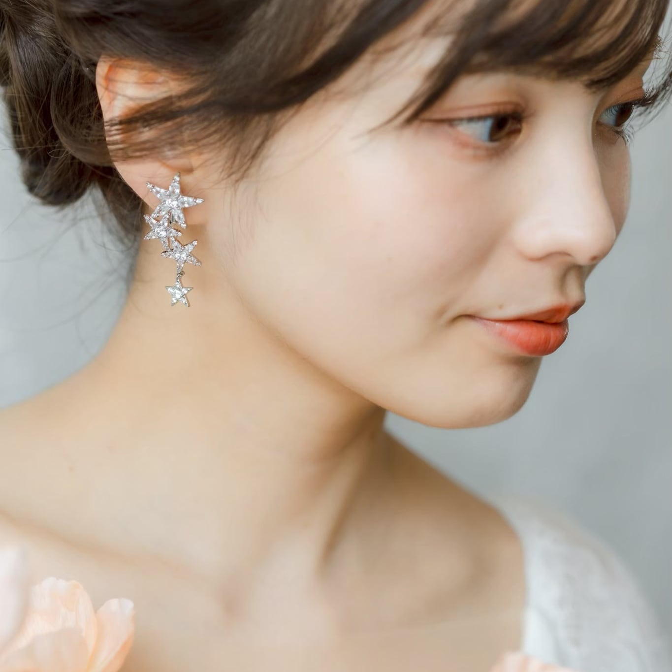 星モチーフを連ねた遊び心あるデザインに、ジルコニアの輝きをプラスしたブライダルアクセサリーです。小さな星が耳元で連なり、光を受けてキラキラと輝き、花嫁様の特別な一日を華やかに演出します。