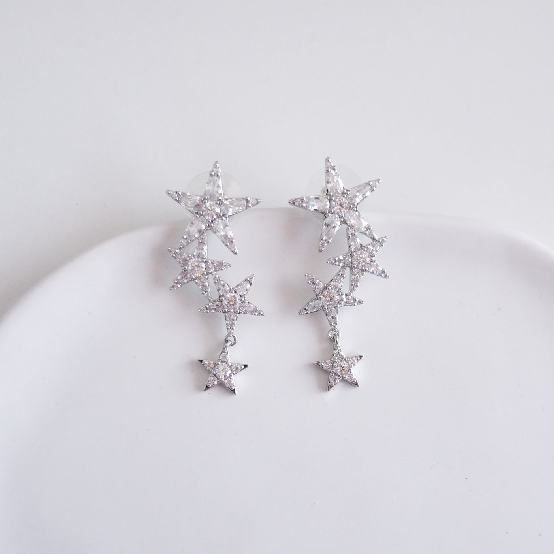 高品質キュービックジルコニアを使用しており、ダイヤモンドのような透明感のある輝きが魅力。星が連なったデザインは、動くたびに表情を変え、写真や映像でも美しく映えるアイテムです。