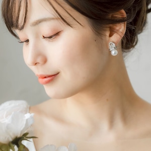柔らかく優しい光沢のパールを組み合わせた小ぶりデザインのブライダルピアスです。