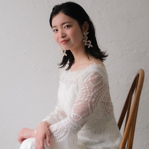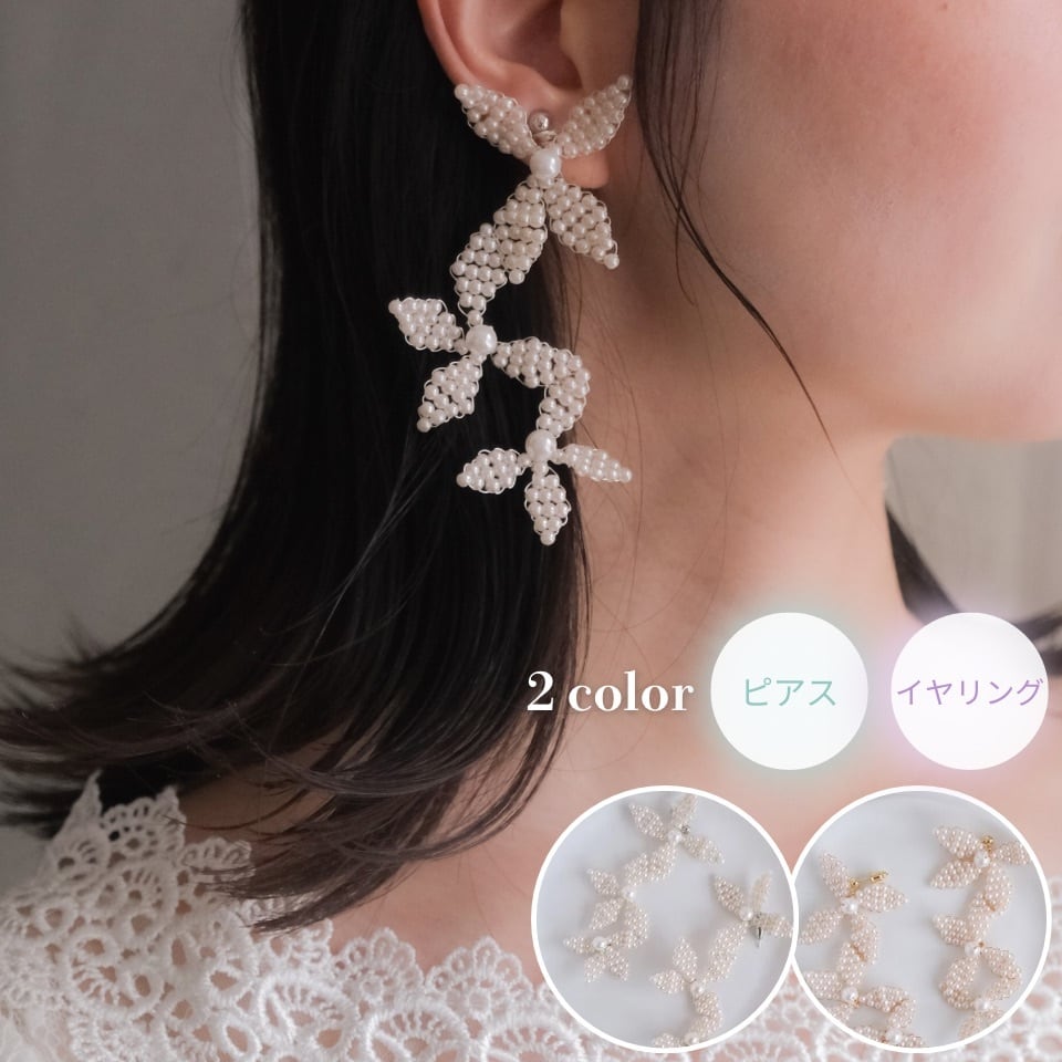 可憐でナチュラルな雰囲気を演出する、3連のフラワーデザインが魅力のブライダルアクセサリーです。小花を思わせるパールビーズを丁寧に組み合わせ、動くたびに上品に揺れて、花嫁様の耳元を華やかに彩ります。