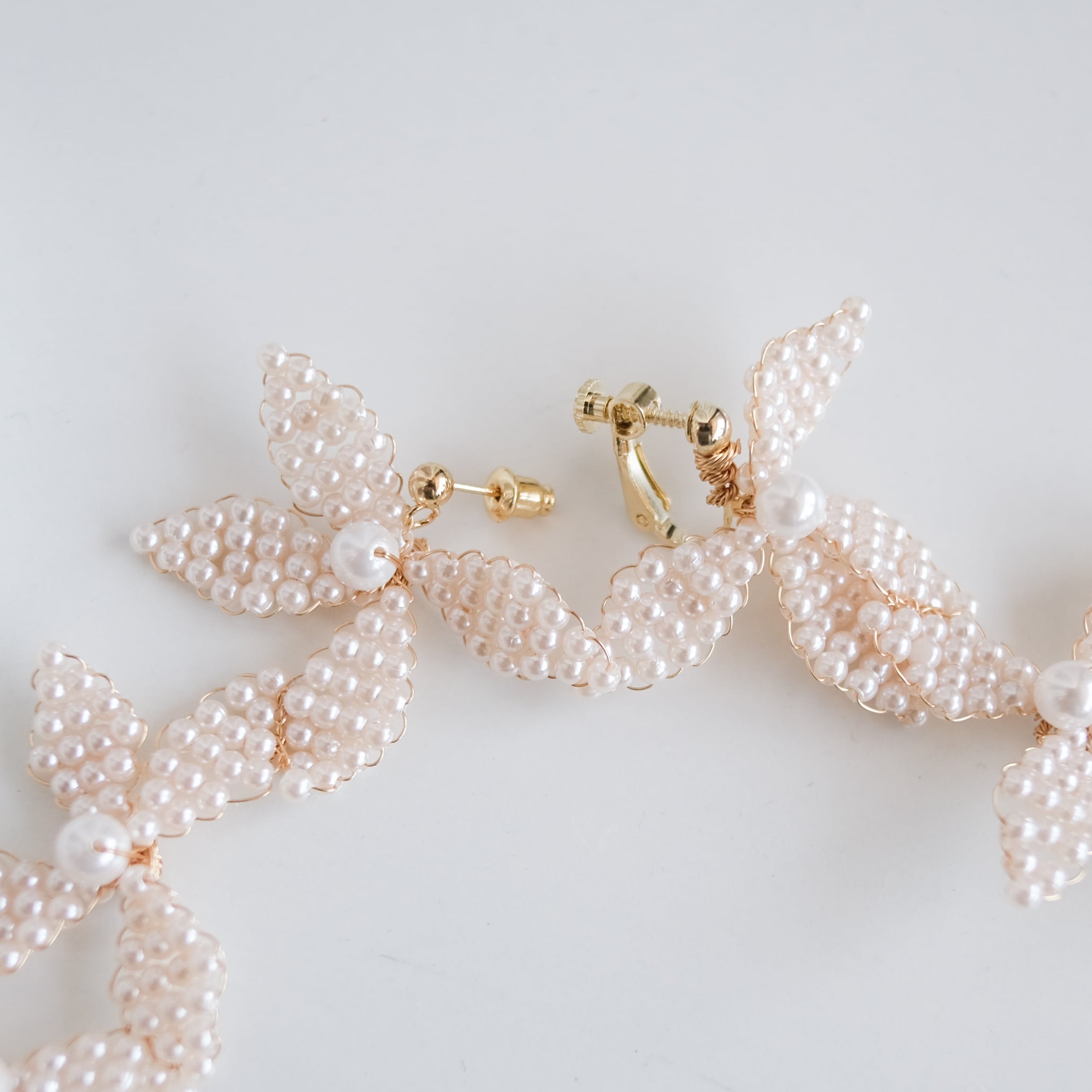 パールビーズで作られた3連フラワーピアス/イヤリング
