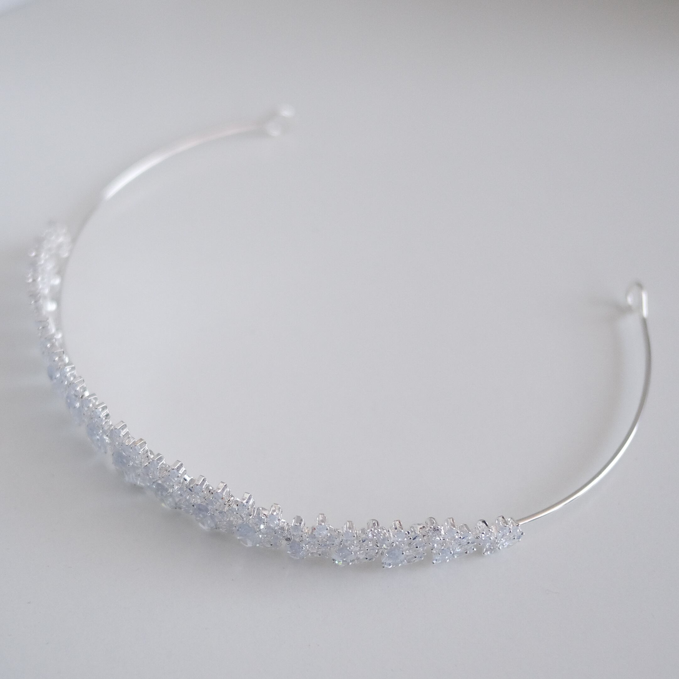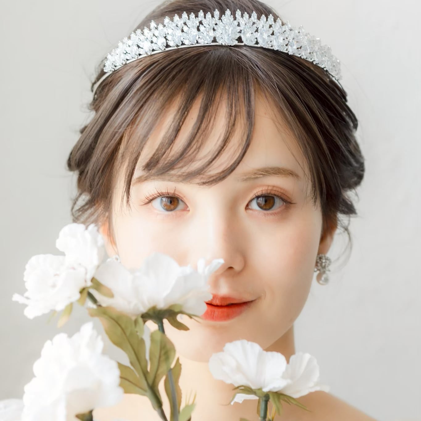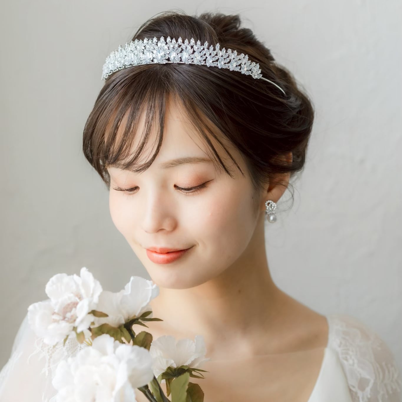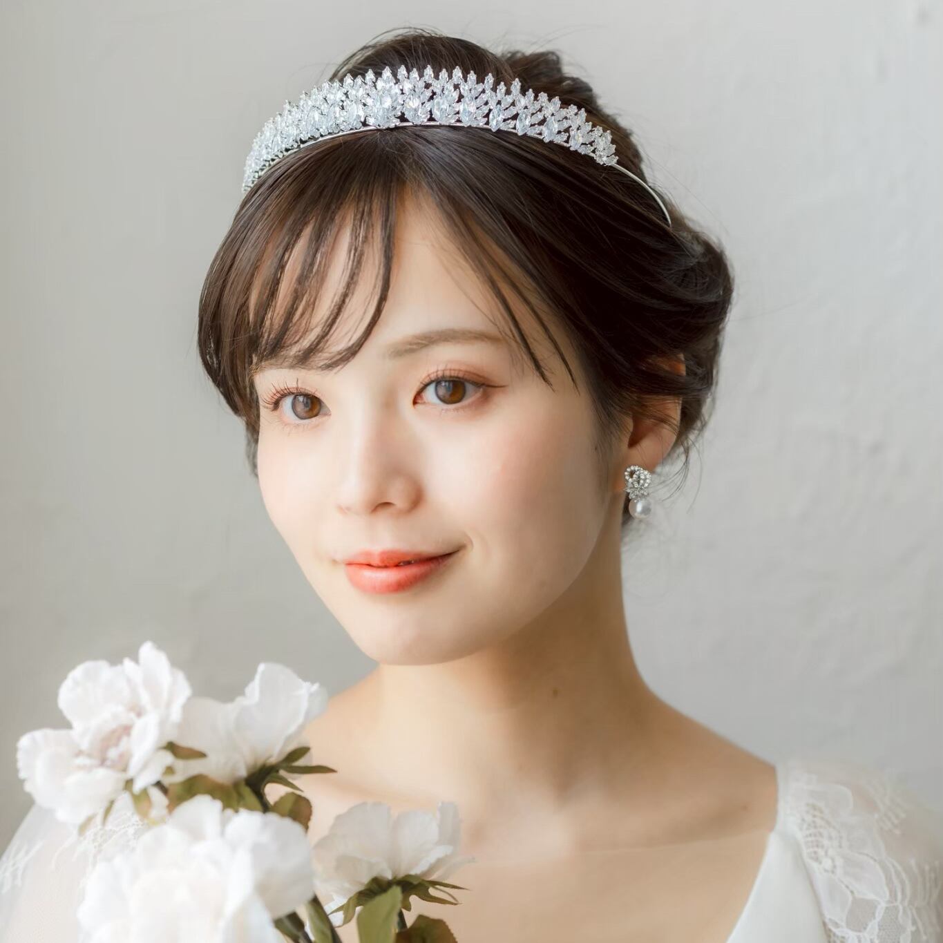 高品質のキュービックジルコニアを使用し、まるでダイヤモンドのような透明感のある輝きを実現。華やかさはありつつも高さが抑えられているため、上品さを大切にしたい花嫁様にぴったりです。派手すぎないバランスが、大人花嫁のブライダルスタイルにもおすすめ。