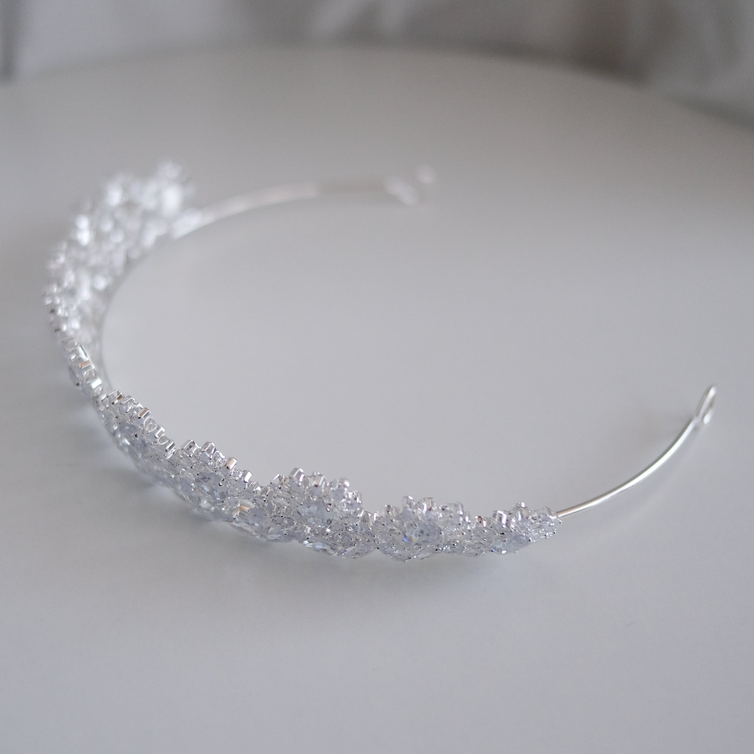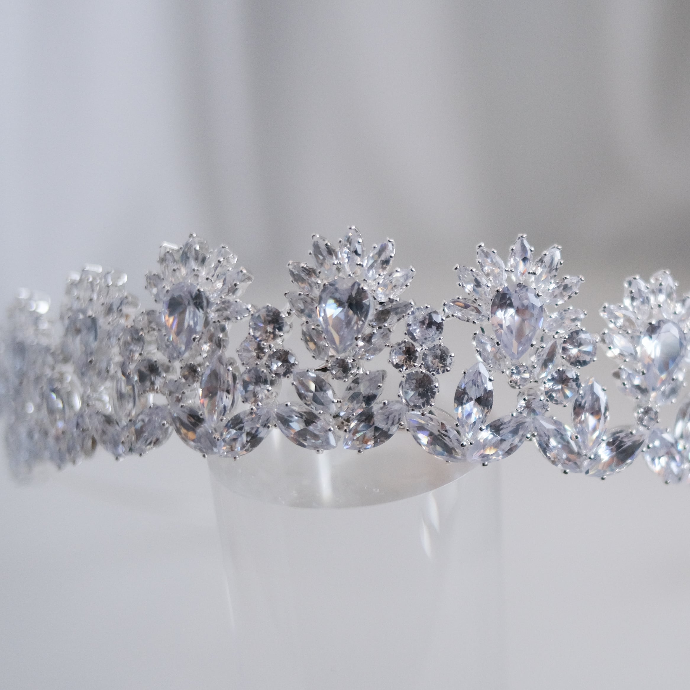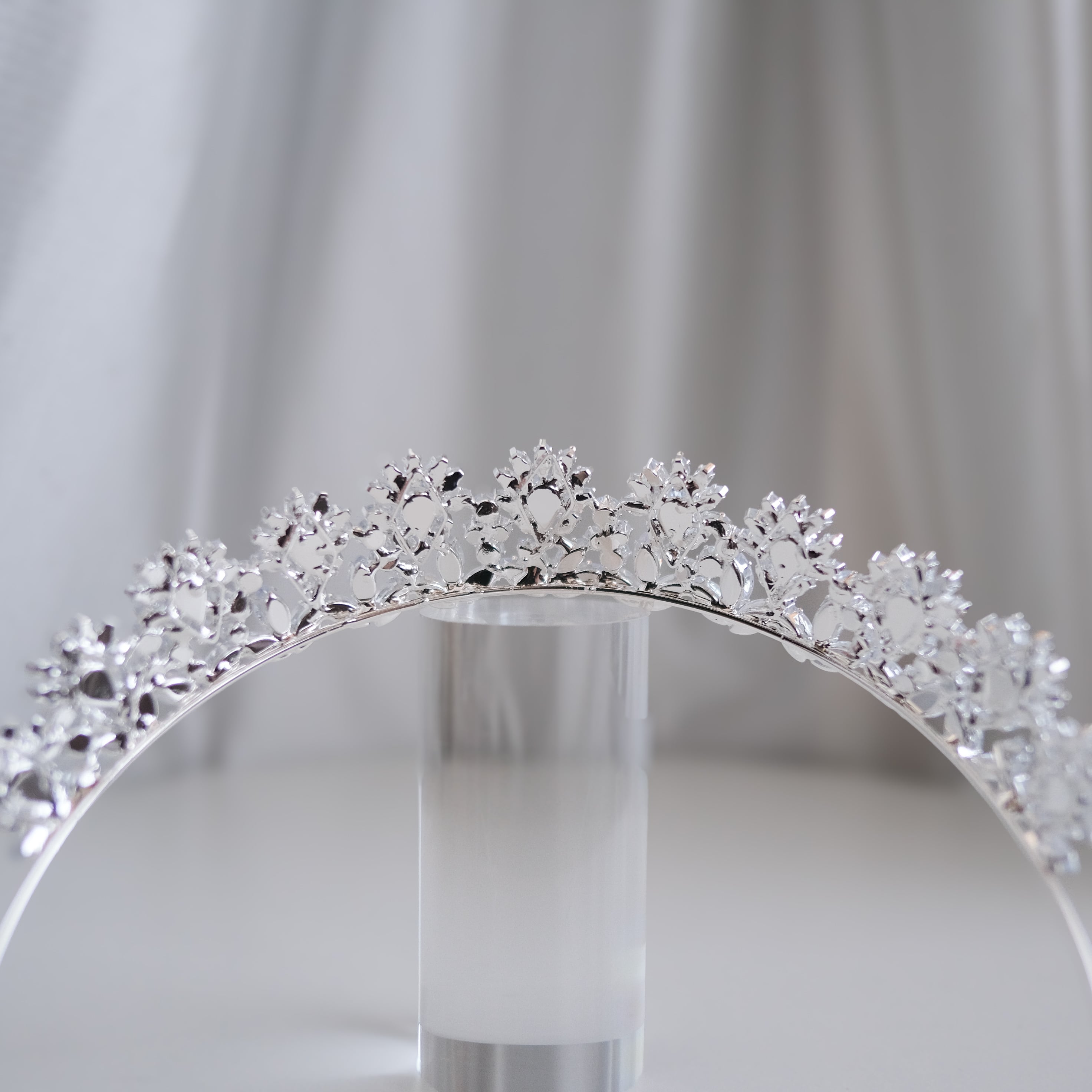 高品質キュービックジルコニアを使用しているため、ダイヤモンドのように透明感のある輝きを放ち、ライトや自然光の下で一層きらめきます。高さは控えめでも、大きめのストーンデザインが写真映えし、上品さと華やかさを両立させたバランスの良いティアラです。
