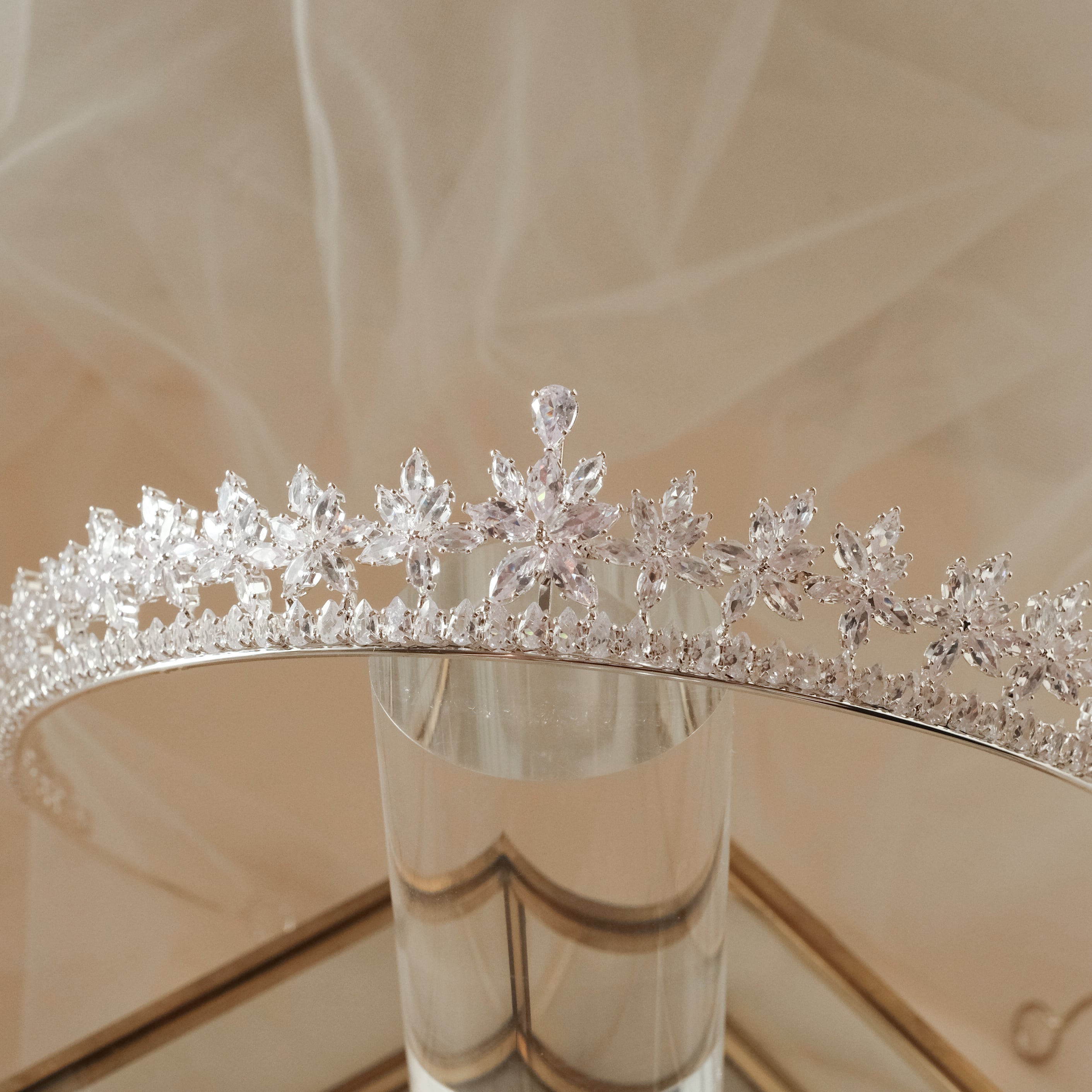 上品で華やかな輝きを放つジルコニアティアラです。まるでプリンセスになれるような王冠タイプのデザインで、結婚式・披露宴・前撮り・二次会などあらゆるシーンで花嫁様を美しく引き立てます。
