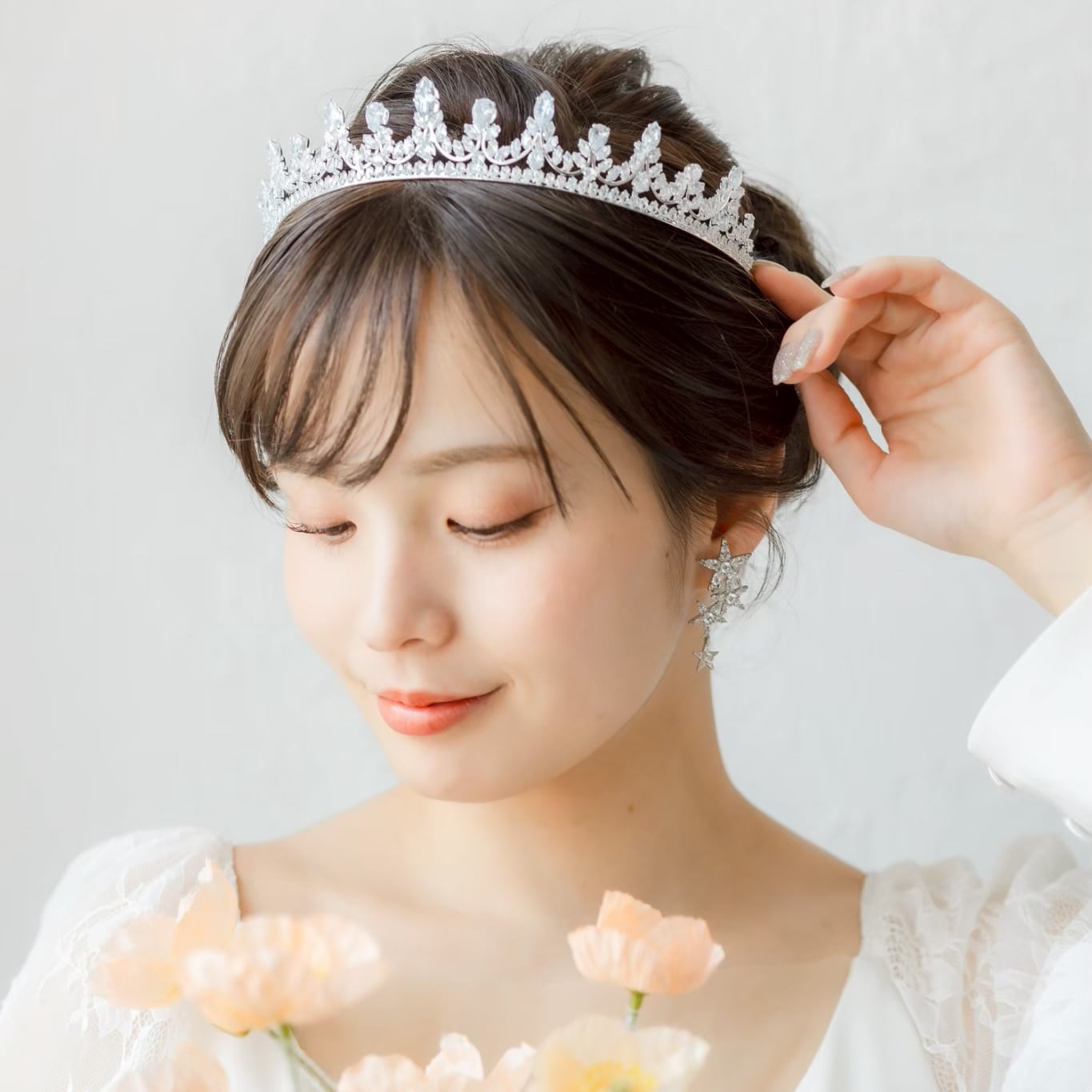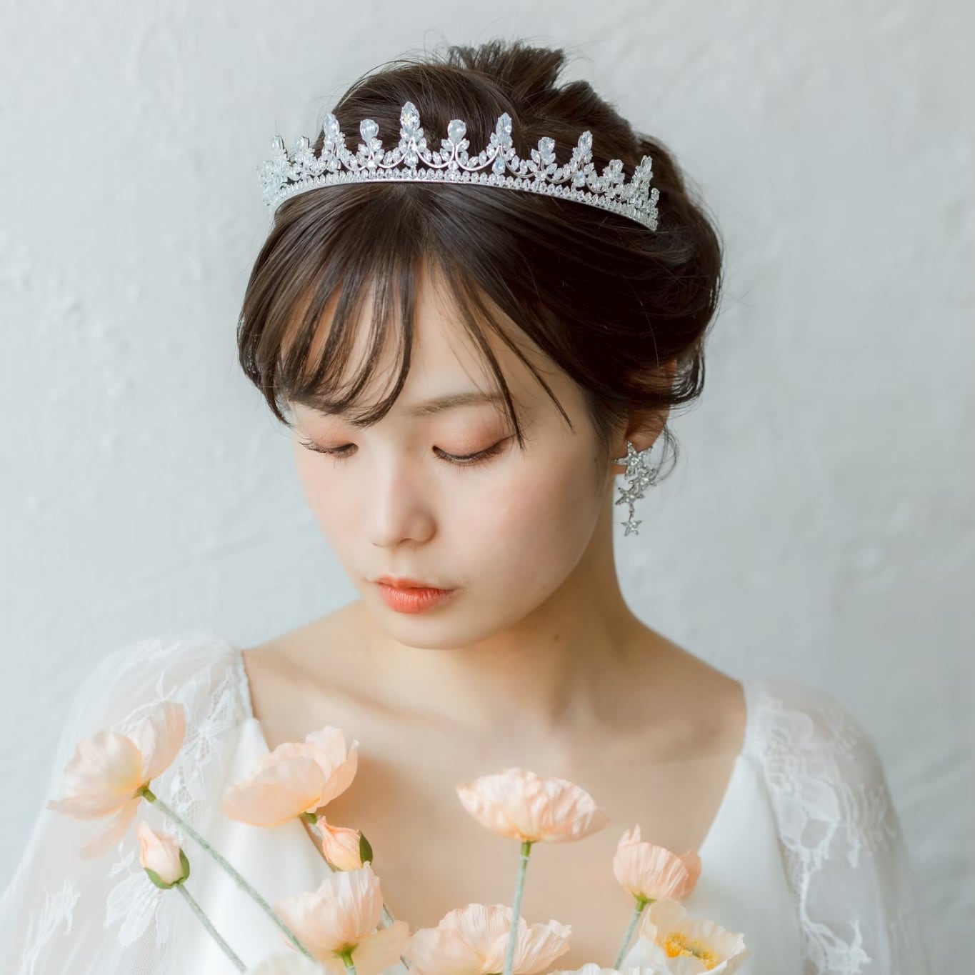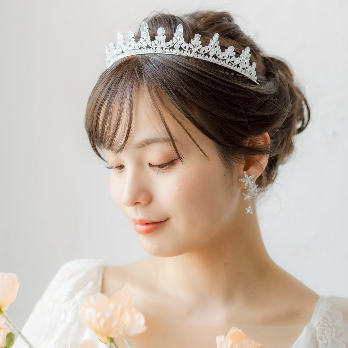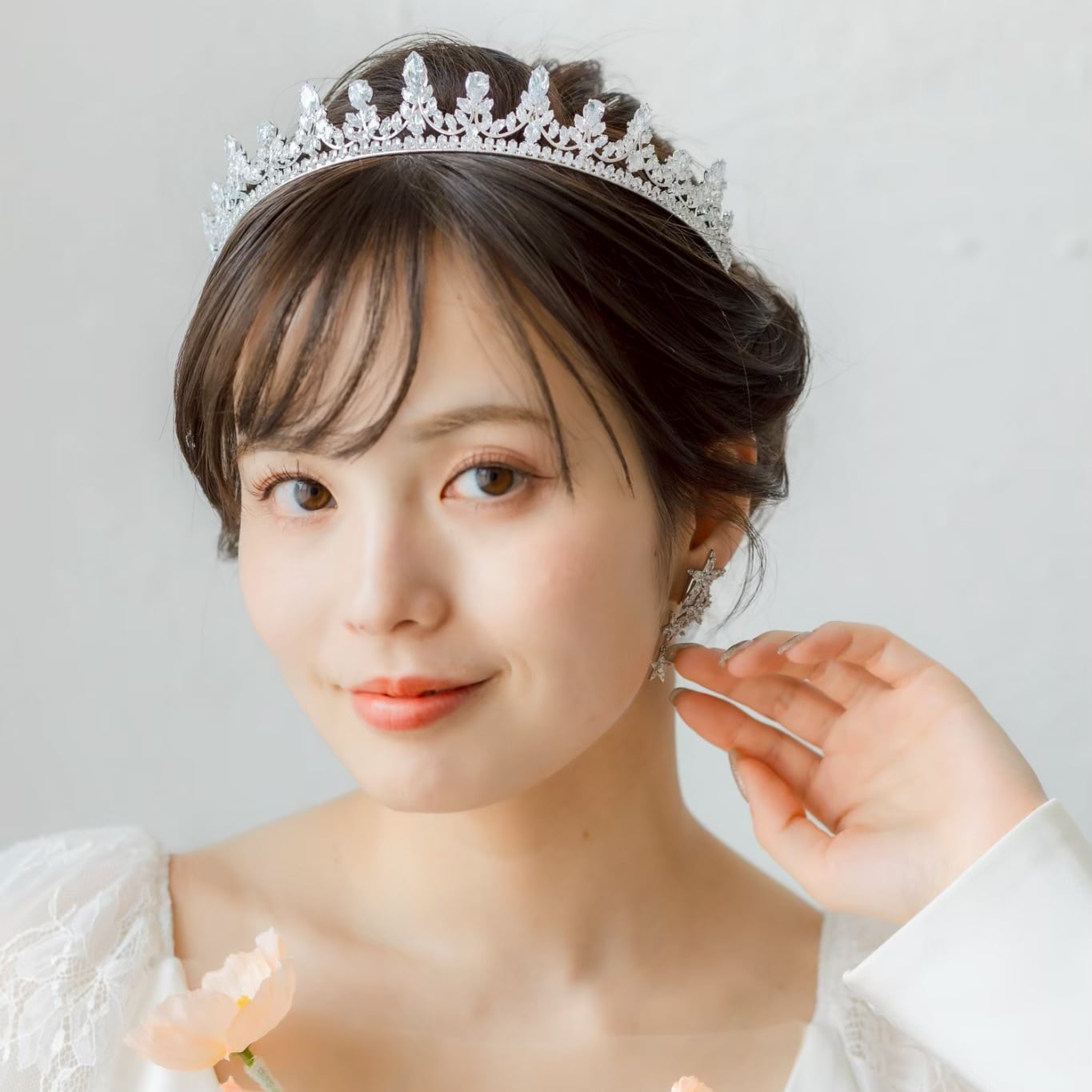 高さ約2.9cmのジルコニアティアラ。まるでプリンセスになれるような王冠タイプのデザインで、花嫁様のブライダルスタイルを一層華やかに引き立てます。高品質キュービックジルコニアを使用し、ダイヤモンドのような輝きを放つため、存在感は抜群。それでいて上品さを失わず、特別な日をより輝かせます。