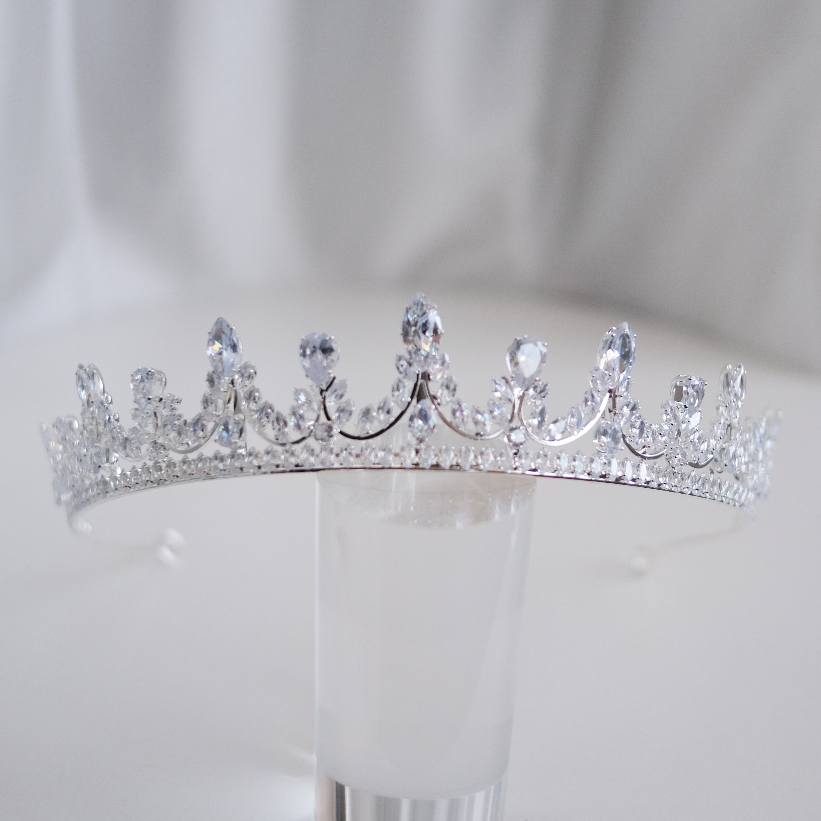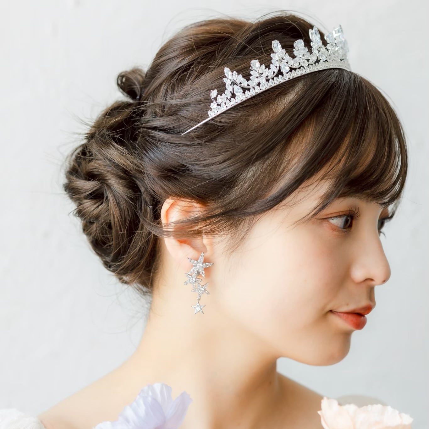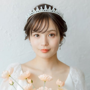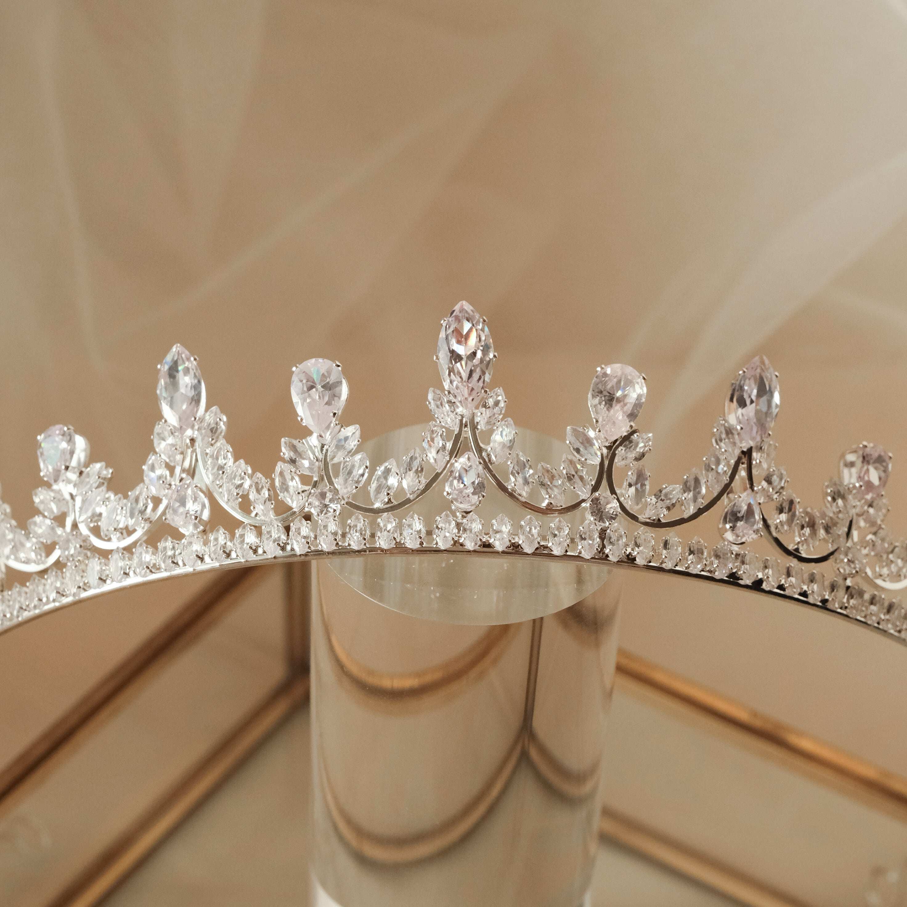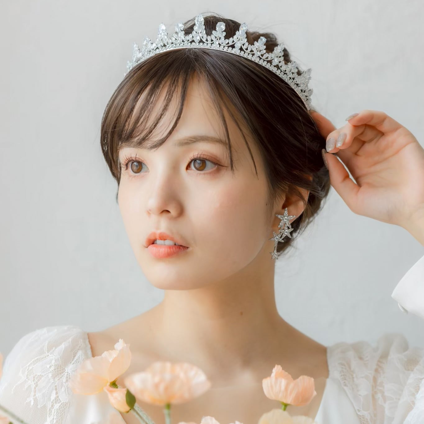 高さ約2.9cmのジルコニアティアラ。まるでプリンセスになれるような王冠タイプのデザインで、花嫁様のブライダルスタイルを一層華やかに引き立てます。高品質キュービックジルコニアを使用し、ダイヤモンドのような輝きを放つため、存在感は抜群。それでいて上品さを失わず、特別な日をより輝かせます。