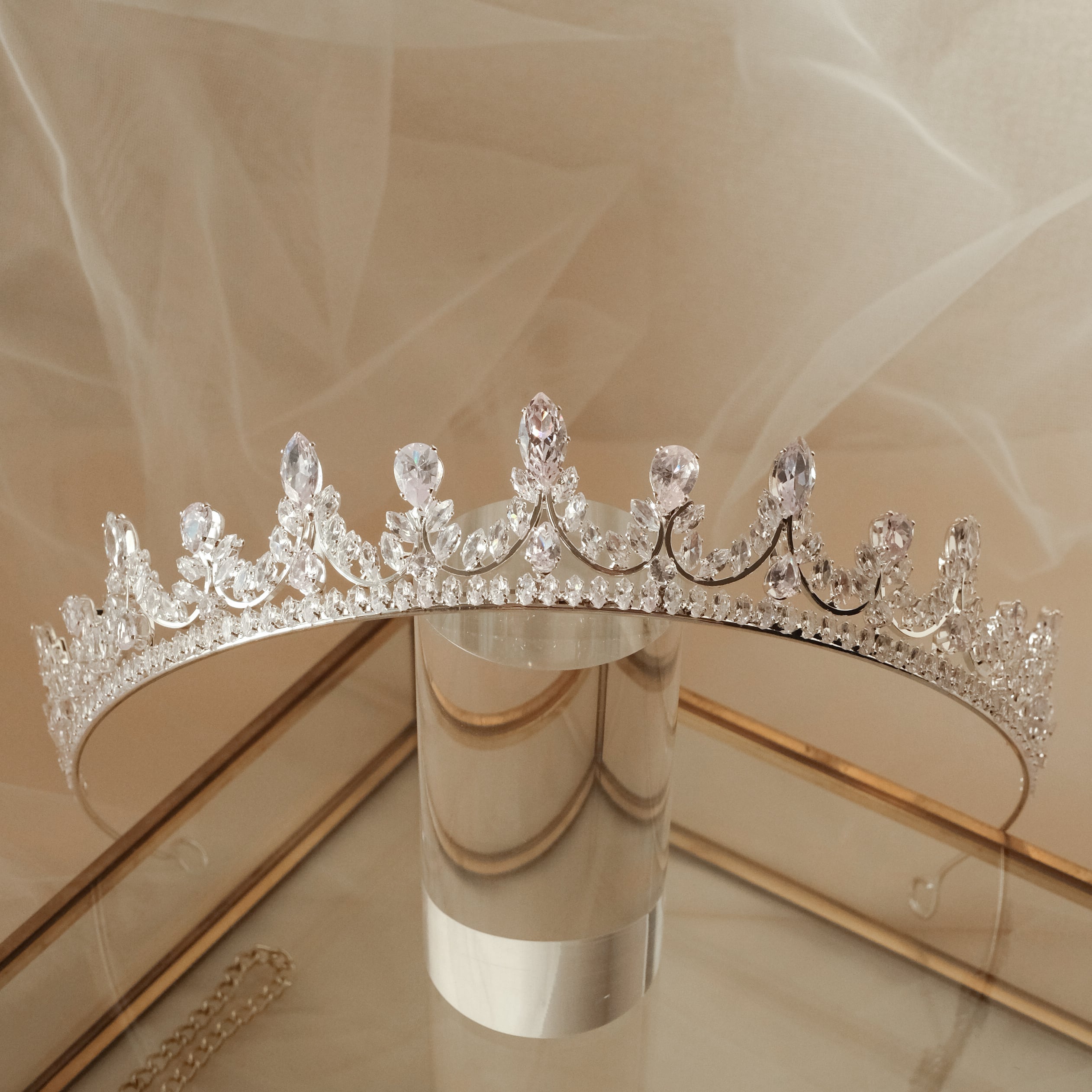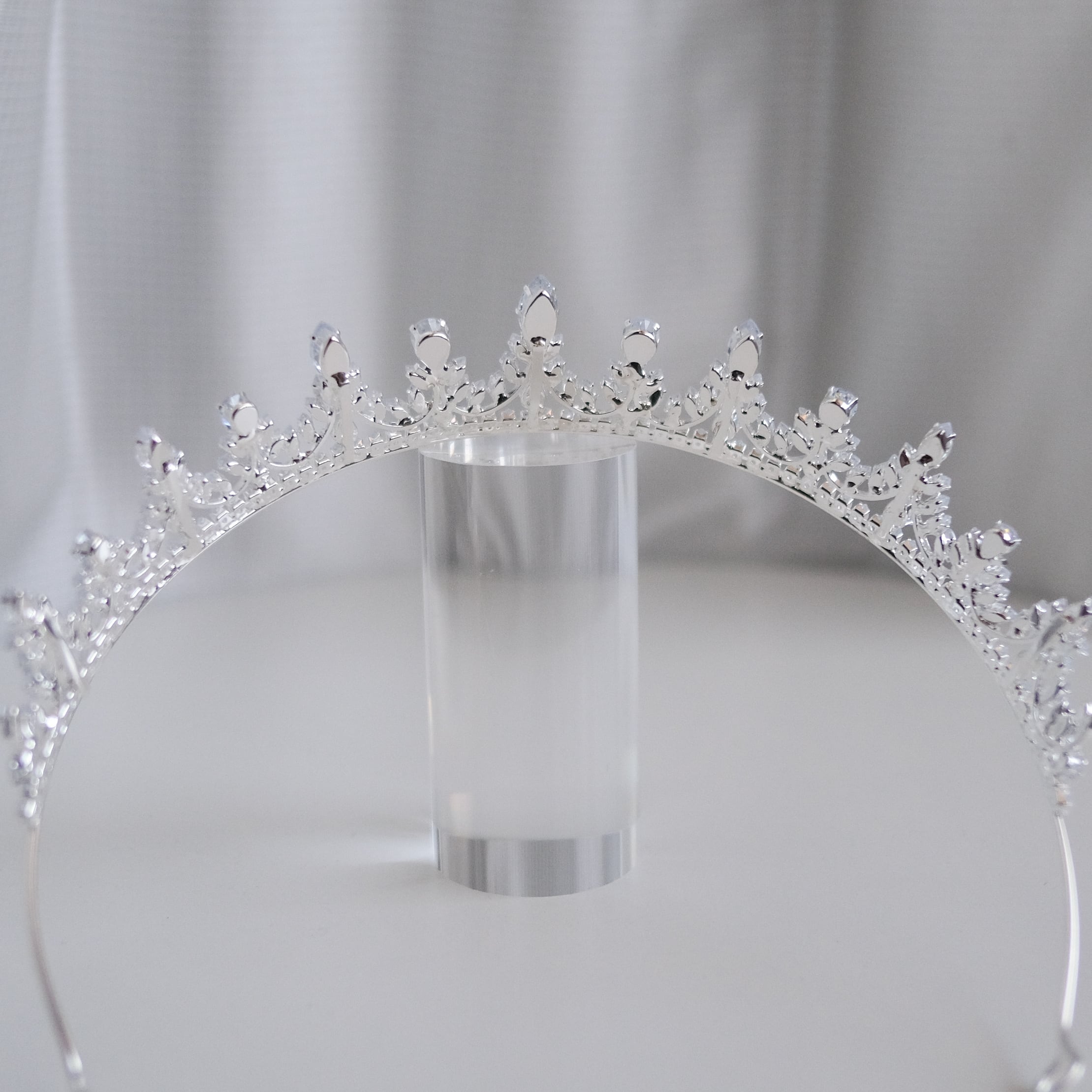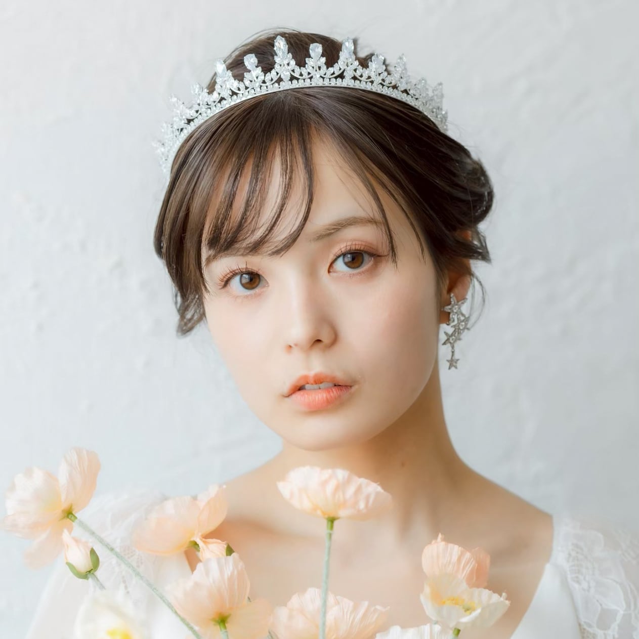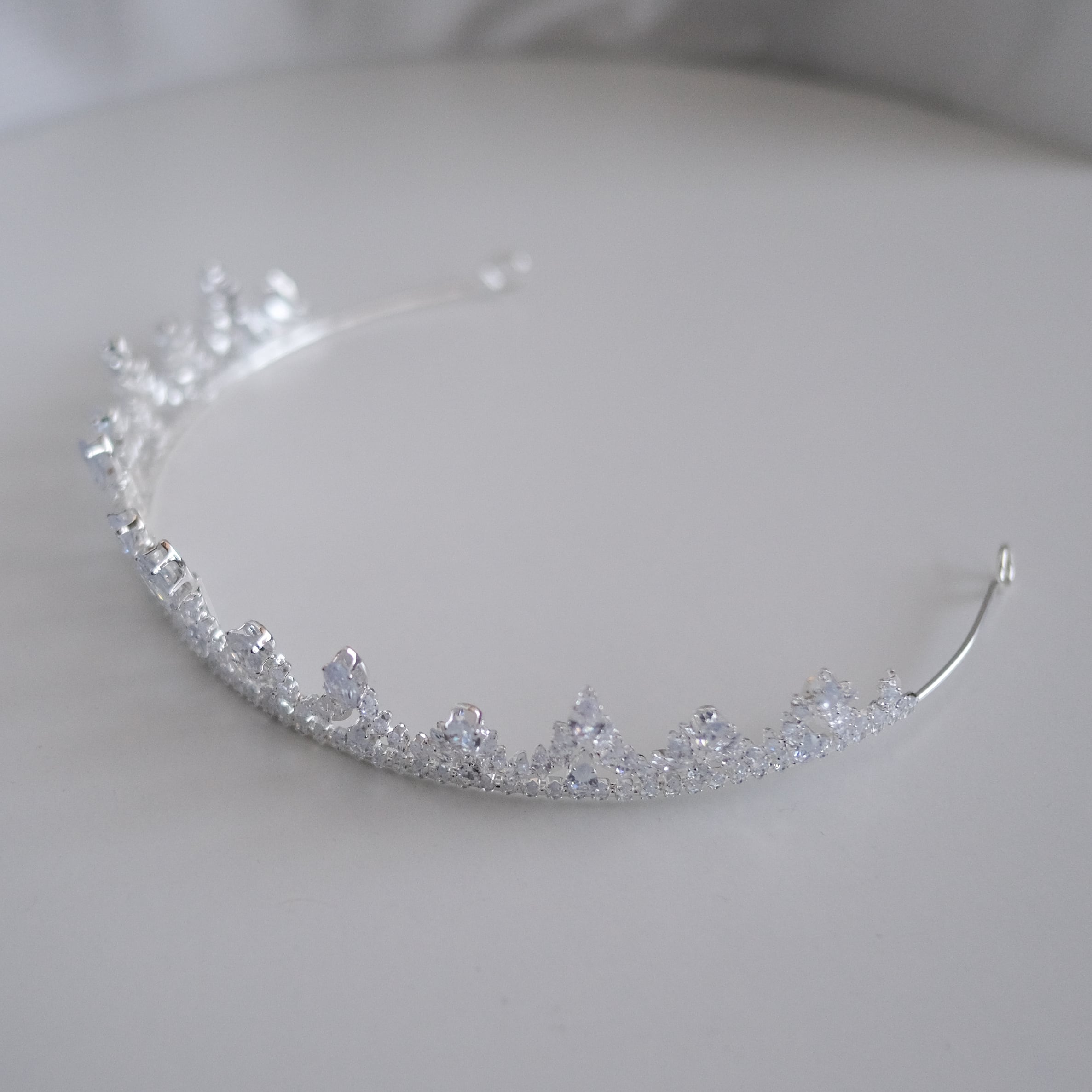 高さ約2.9cmのジルコニアティアラ。まるでプリンセスになれるような王冠タイプのデザインで、花嫁様のブライダルスタイルを一層華やかに引き立てます。高品質キュービックジルコニアを使用し、ダイヤモンドのような輝きを放つため、存在感は抜群。それでいて上品さを失わず、特別な日をより輝かせます。