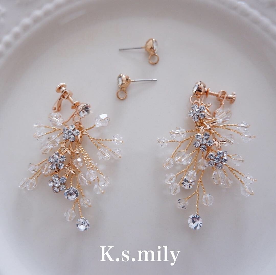f5-pe3【ピアス /イヤリング】ブライダル 小枝 ビジュー ゴールド