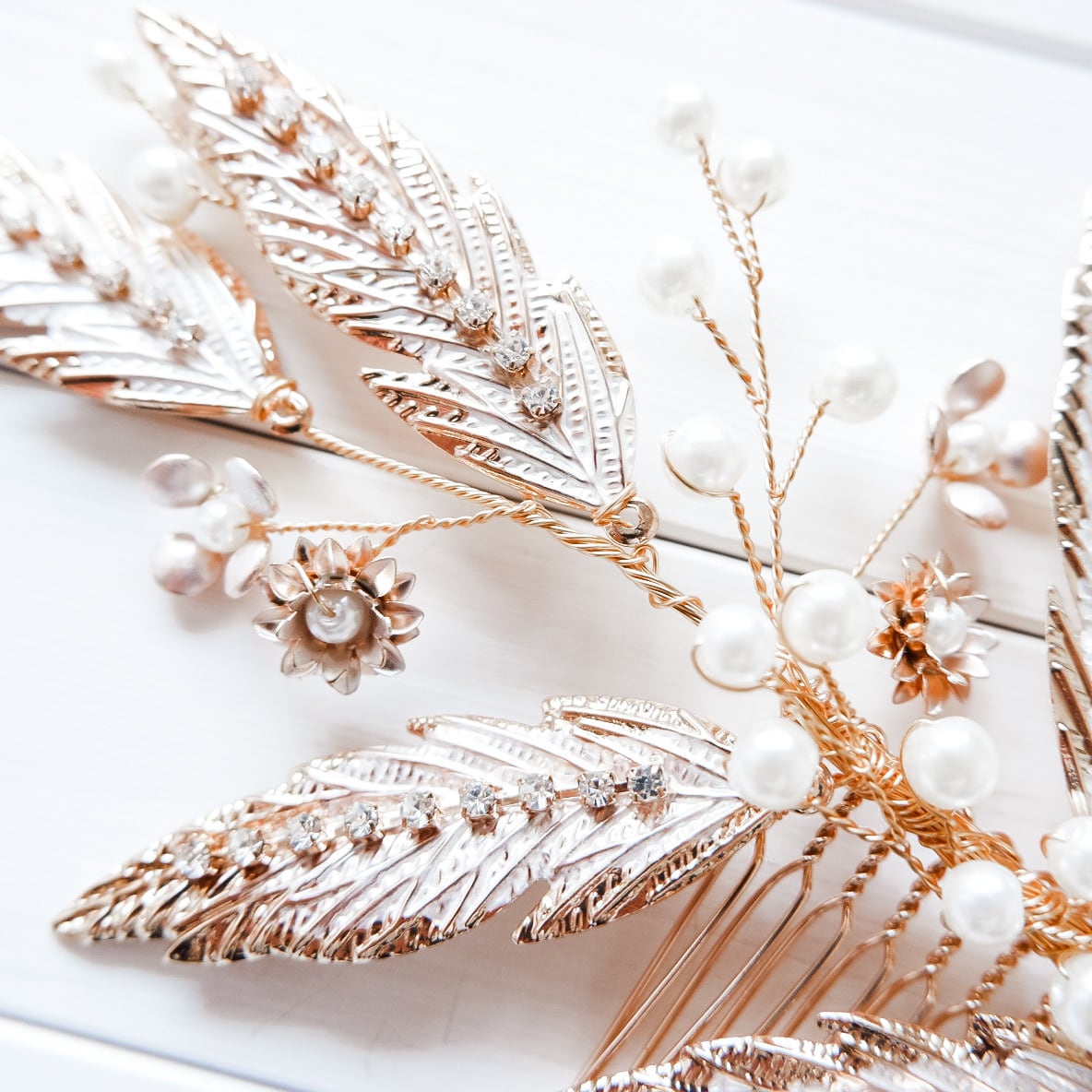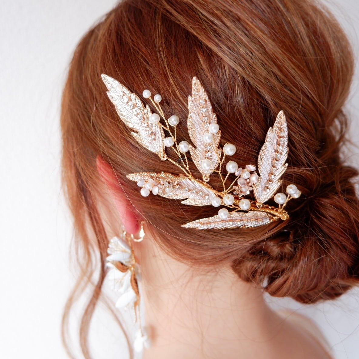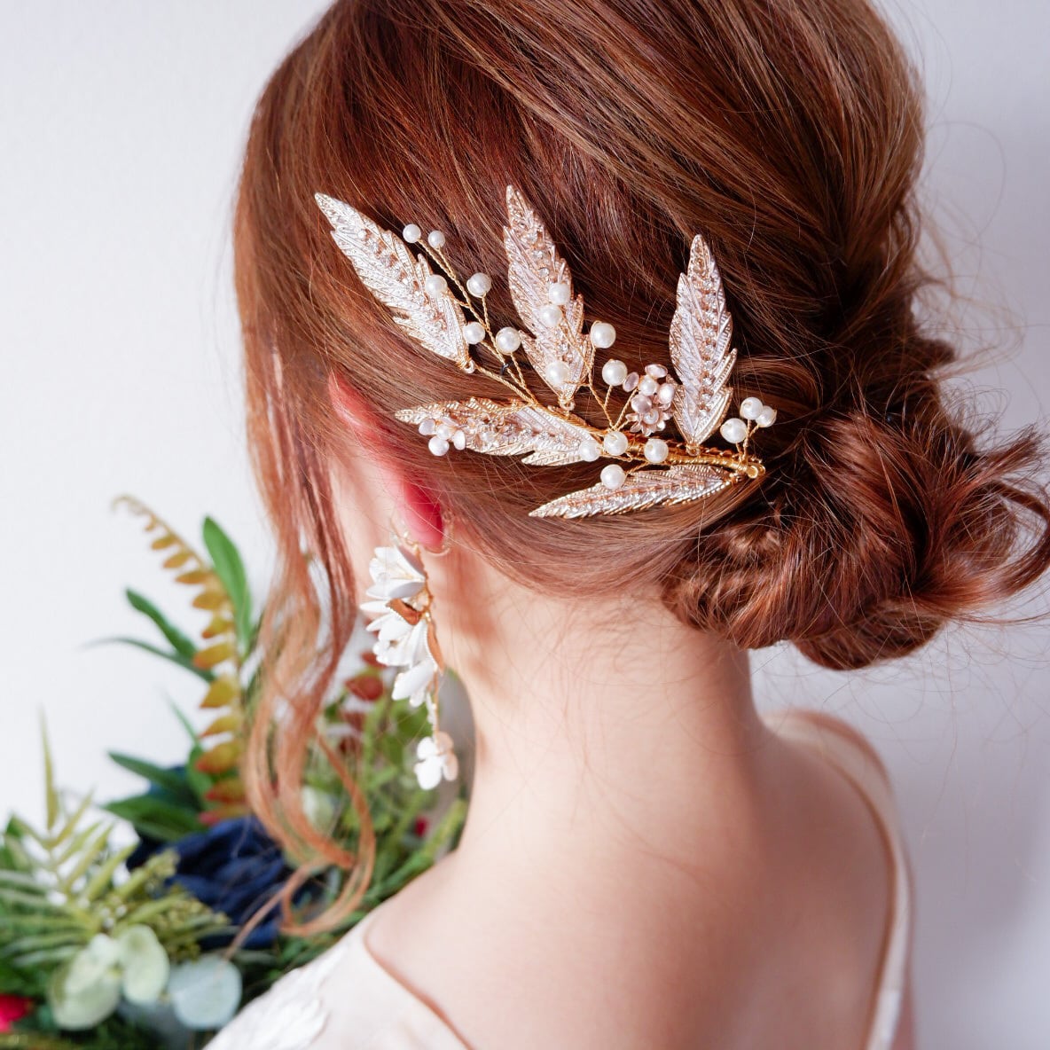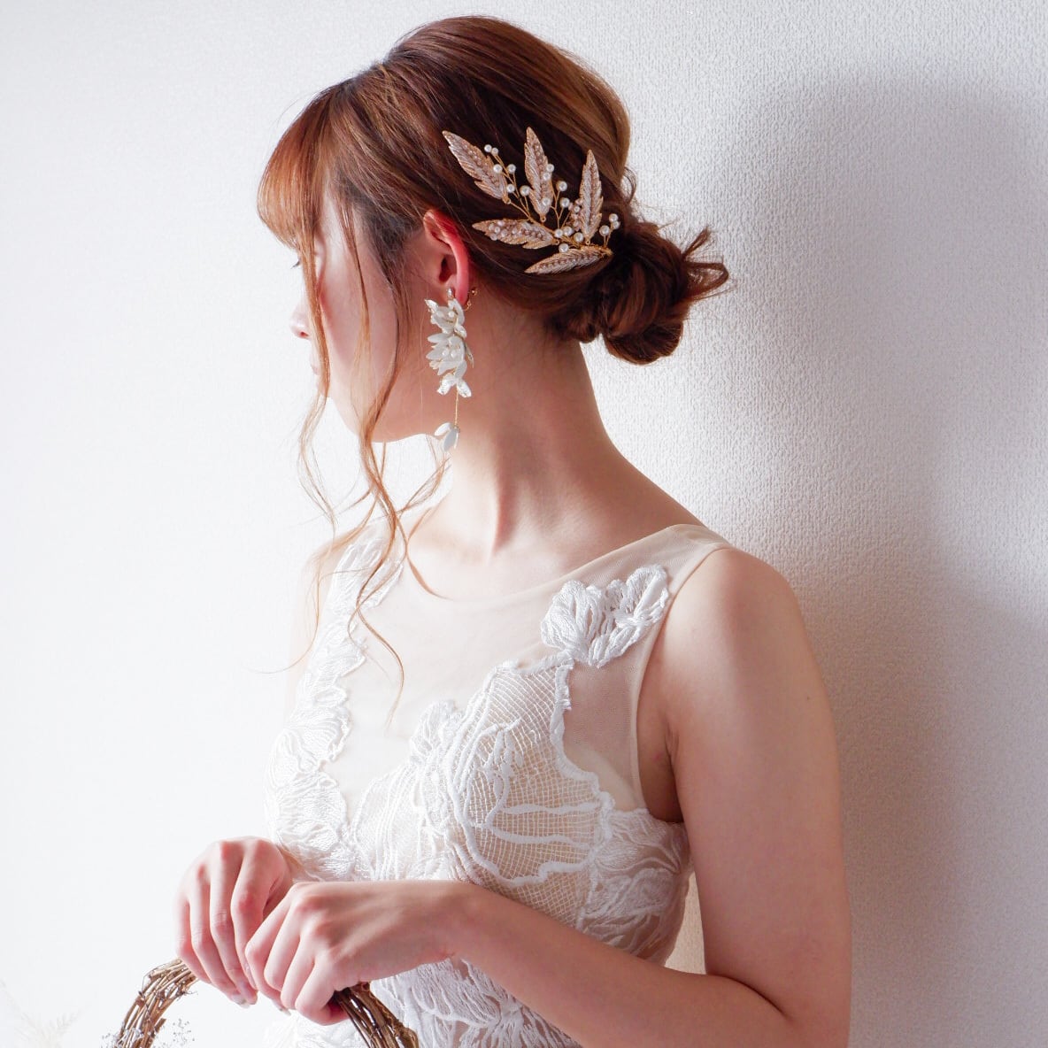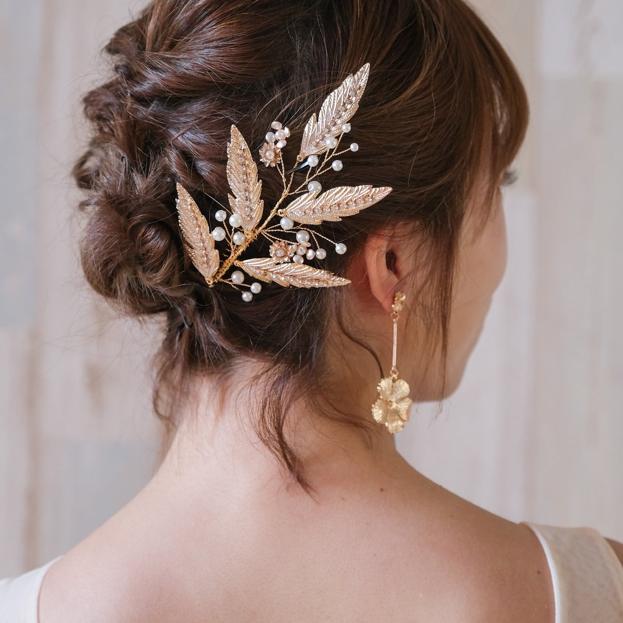 p1-hd44 ブライダルヘッドドレス ビジュー リーフ ボンネ ゴールド