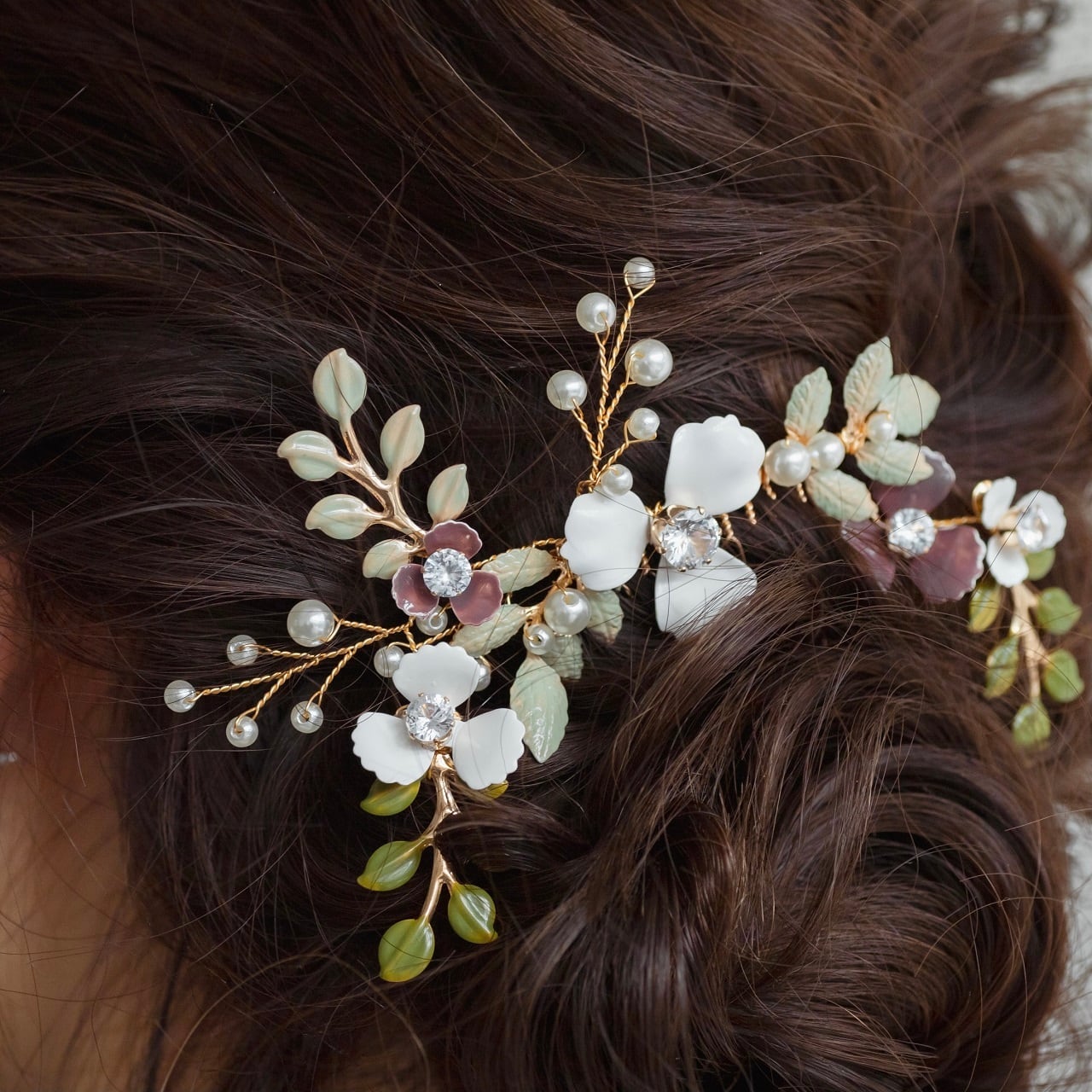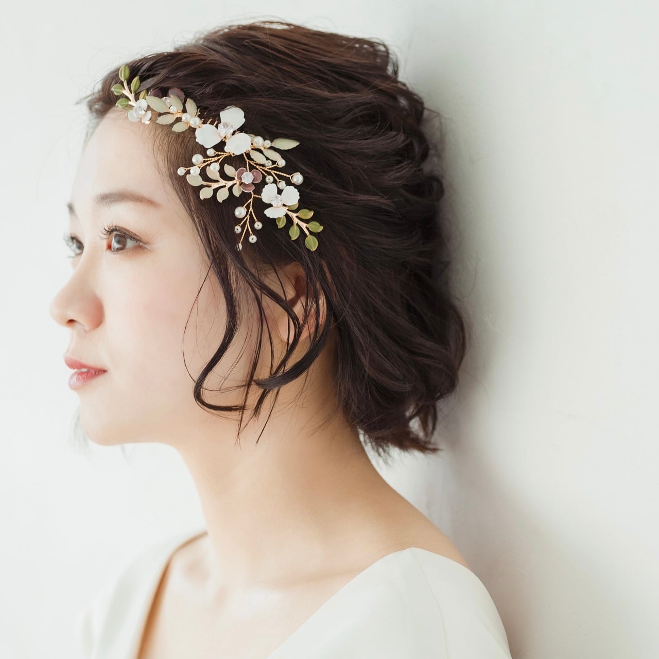 ・白い花と緑のリーフのナチュラルヘッドドレス