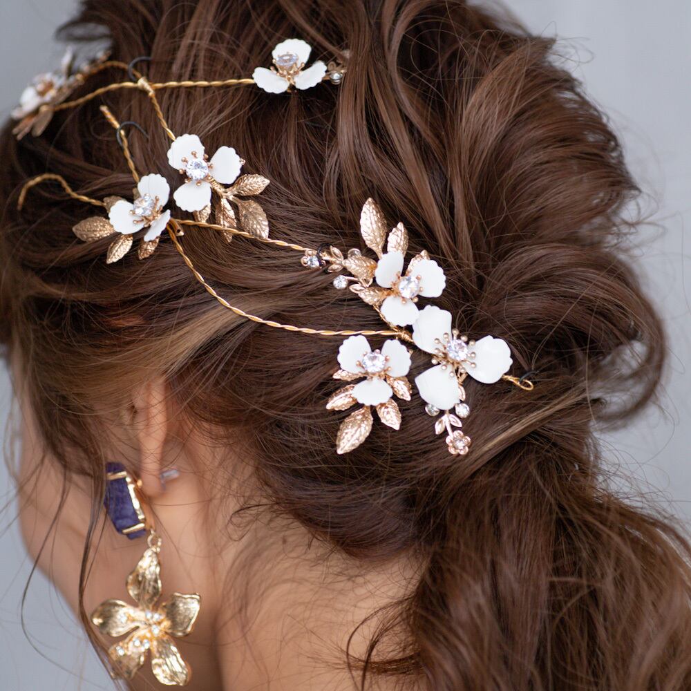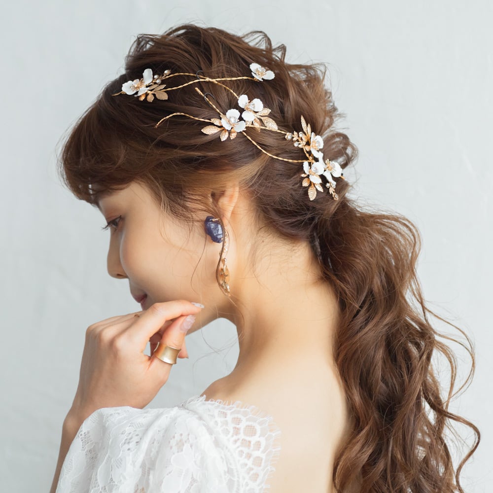 ※ビジュー、ホワイトフラワー、ゴールドリーフ、ゴールドワイヤー