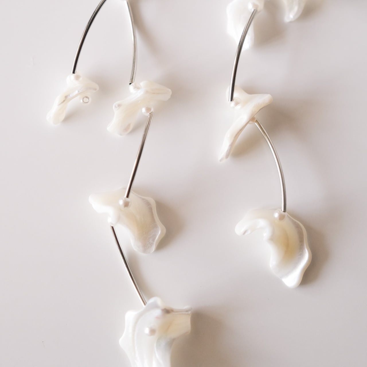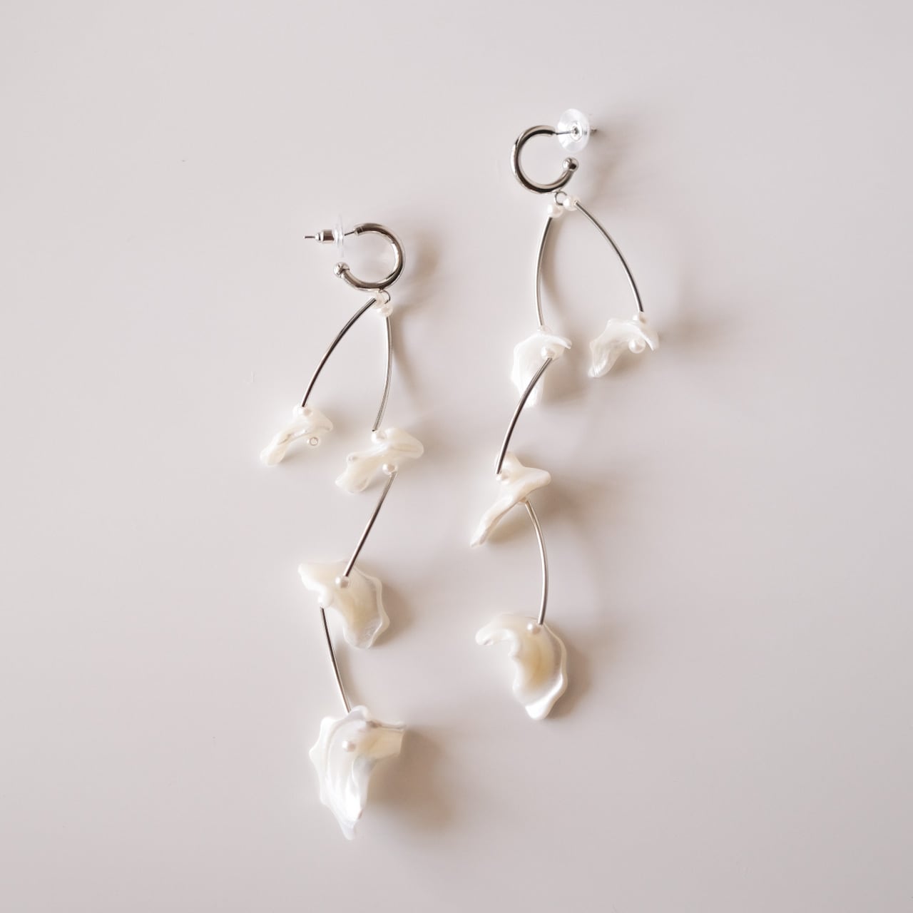 ロングシェルピアスにパールとシルバーのアクセントが散りばめられ、