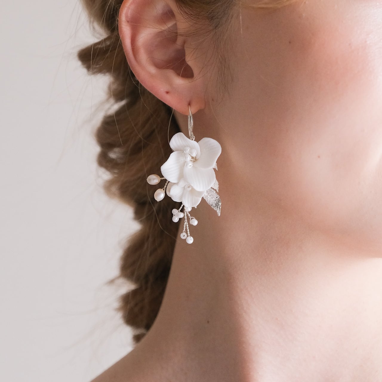 ナチュラルで可憐なウェディングスタイルにぴったりの、小さな花と葉っぱのデザインがとってもかわいい小枝ピアス。
