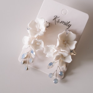 ブライダルにふさわしい、小さな花とビジューが美しく輝く白い花束のような小枝ピアスです。