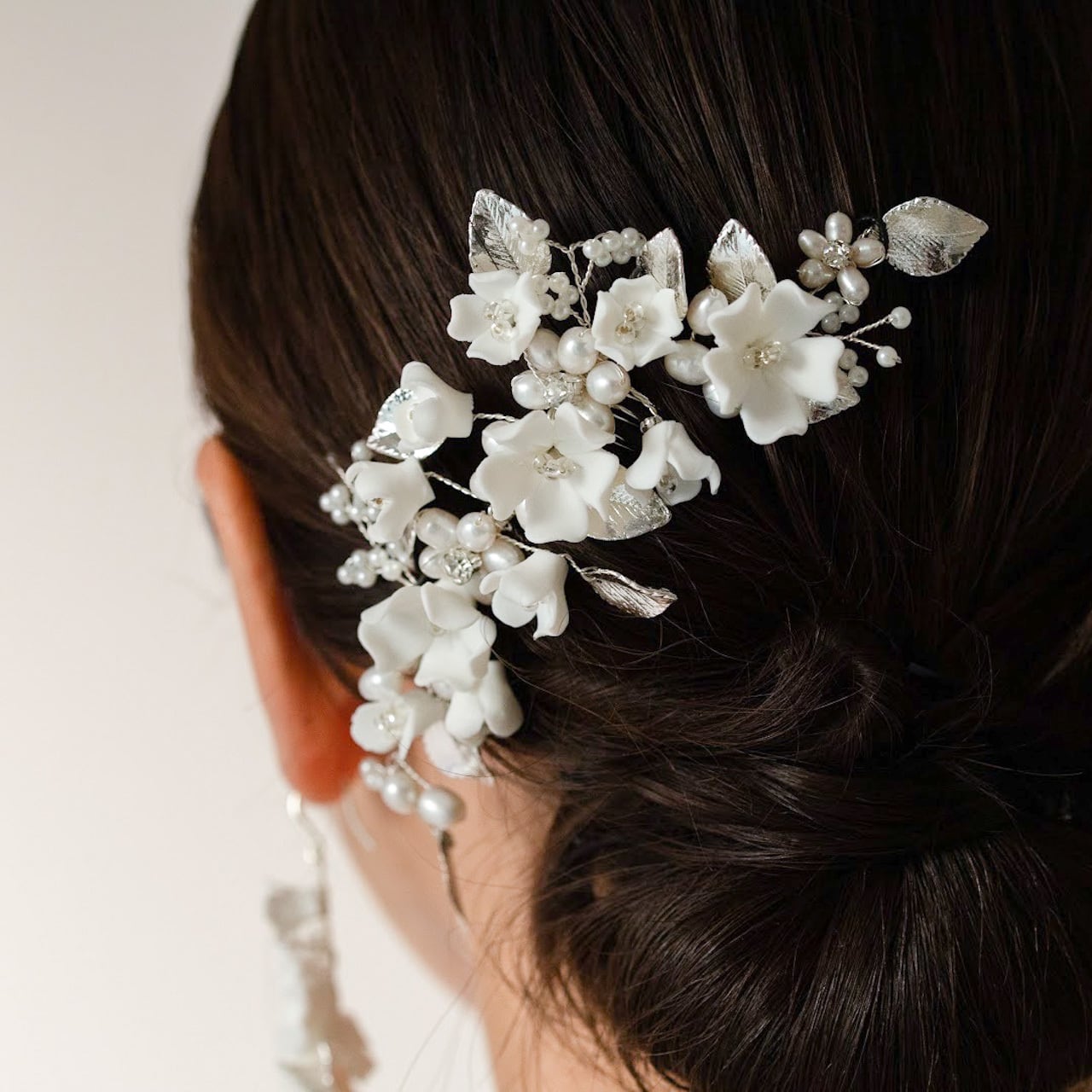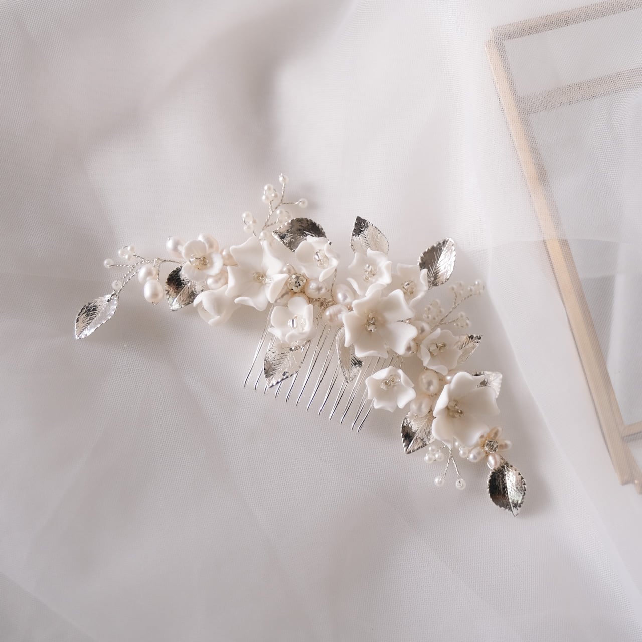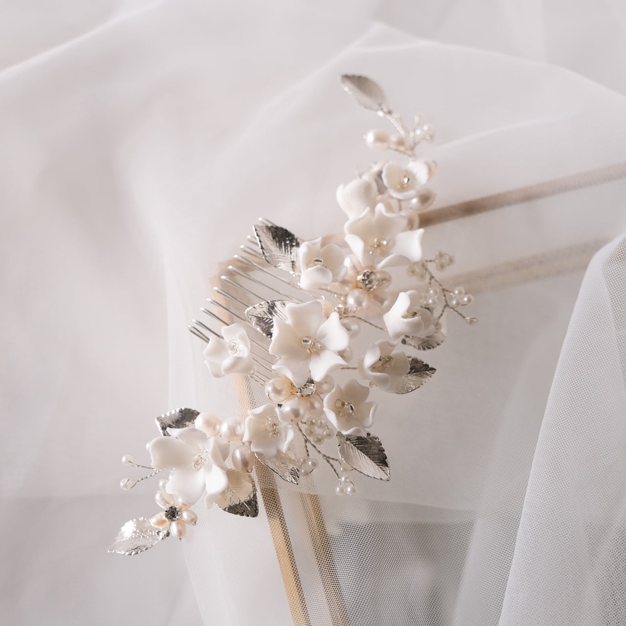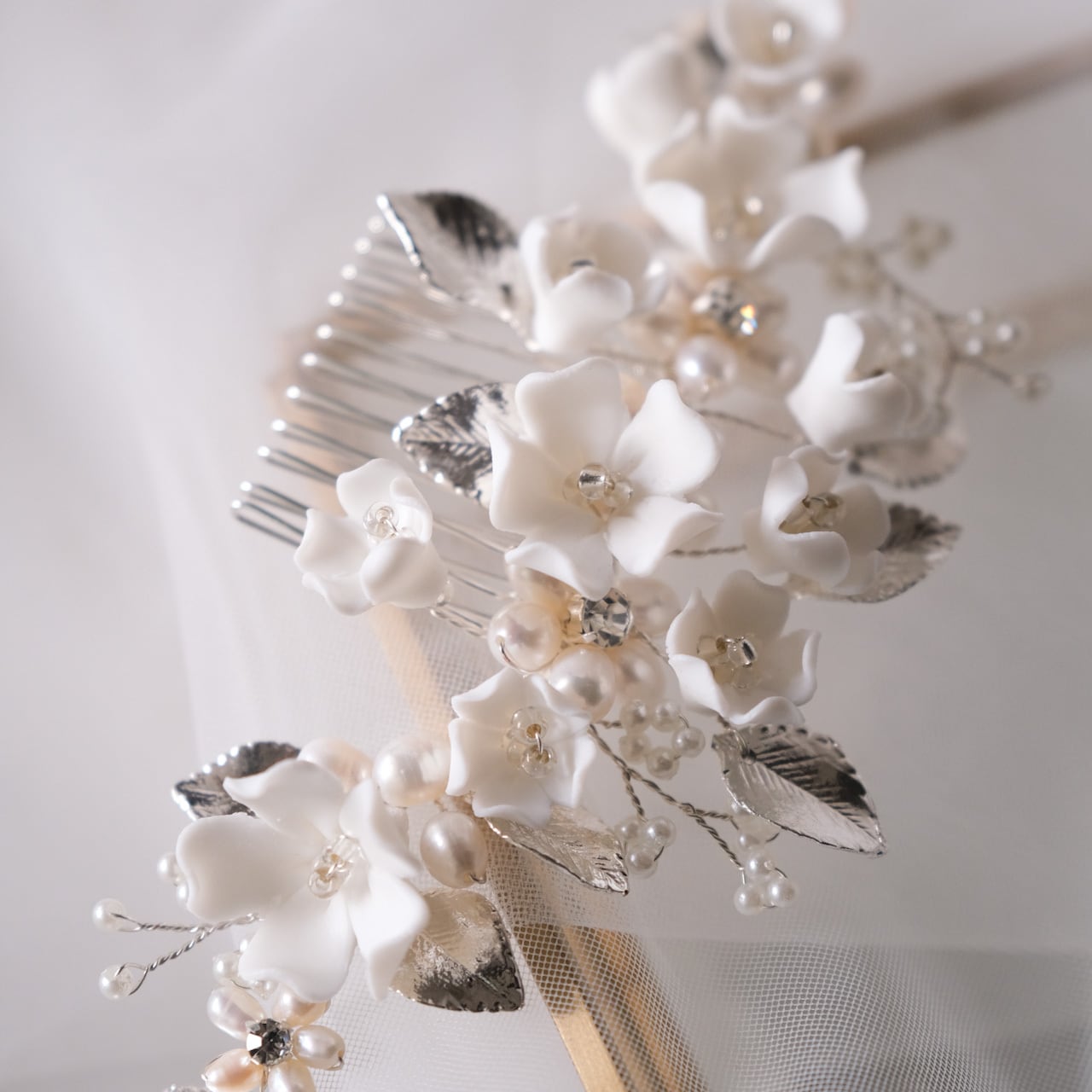 ホワイトフラワーとパールビーズが織り成す上品なデザインが特長です。