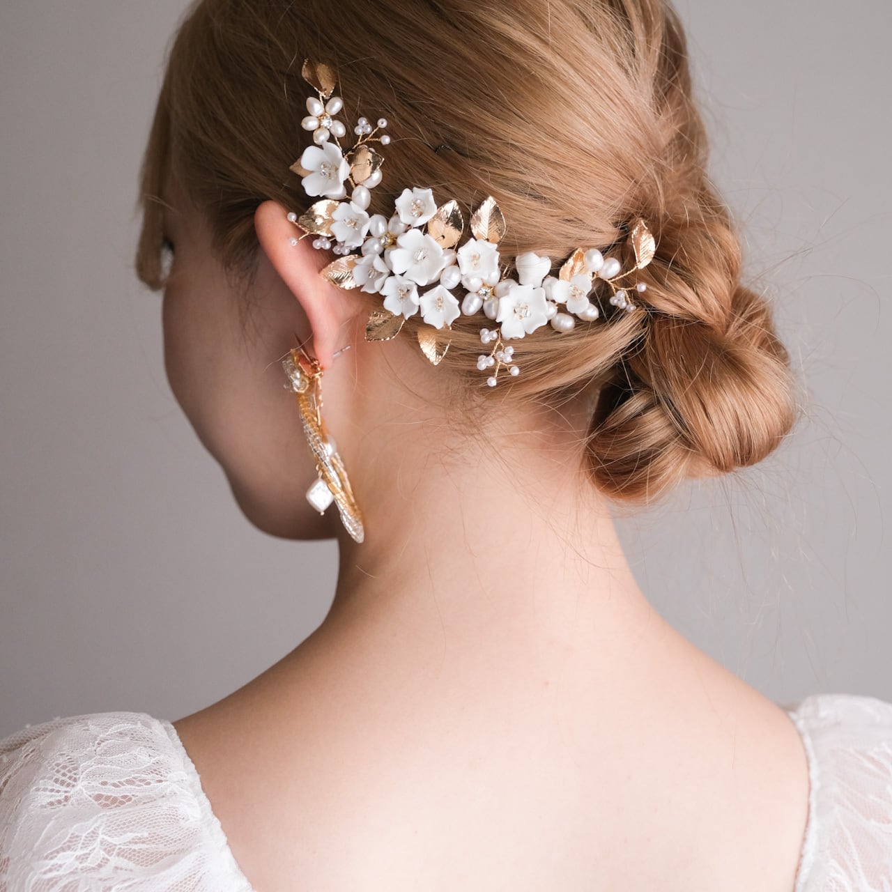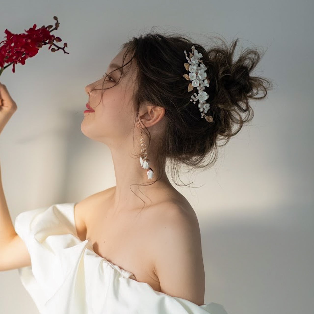 ホワイトフラワーとパールビーズが織り成す上品なデザインが特長です。