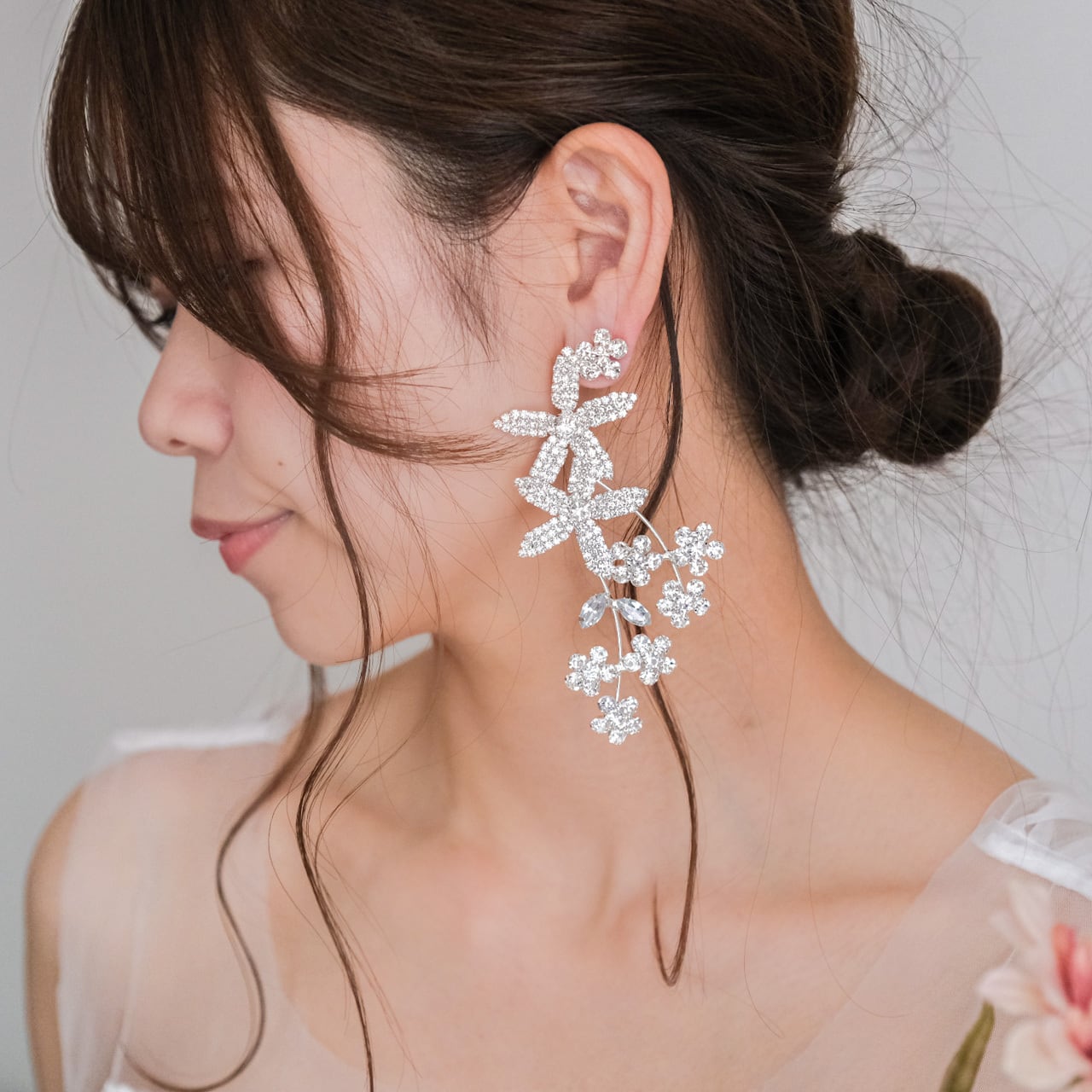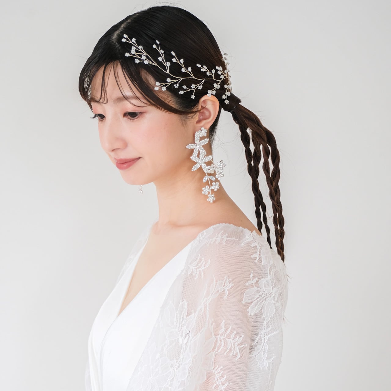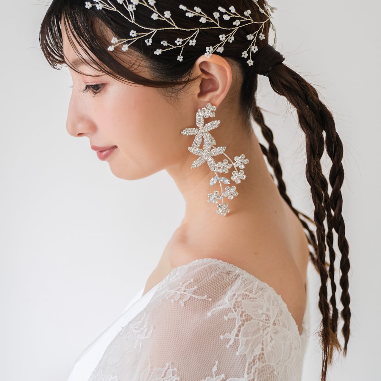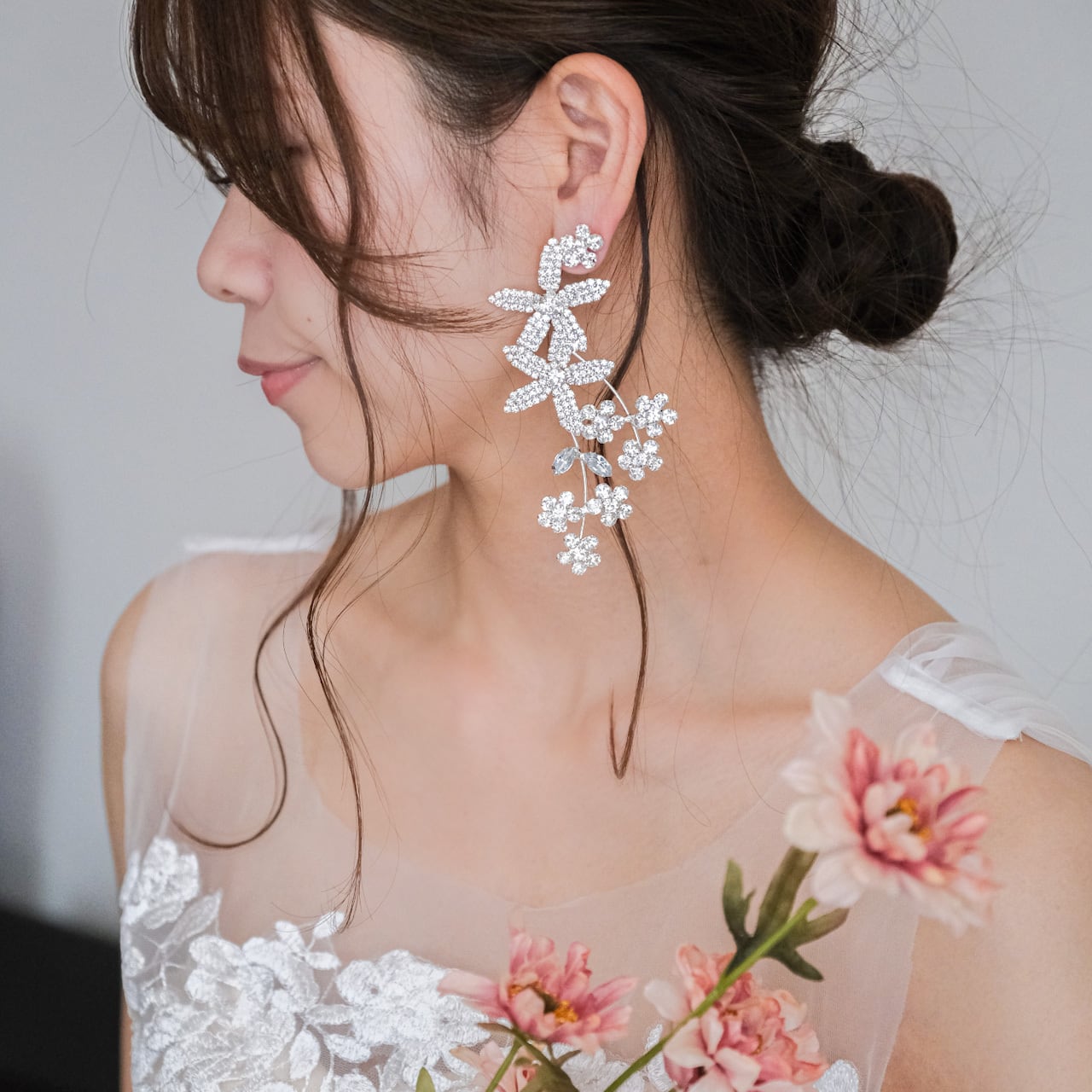 ロングフラワーの存在感で、耳元から華やかな印象があふれ、