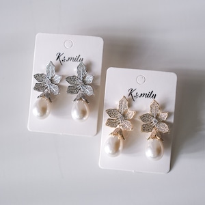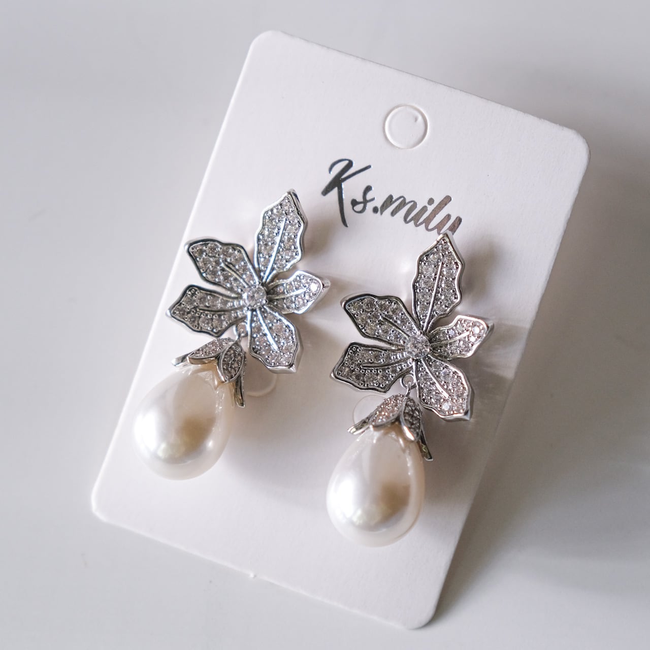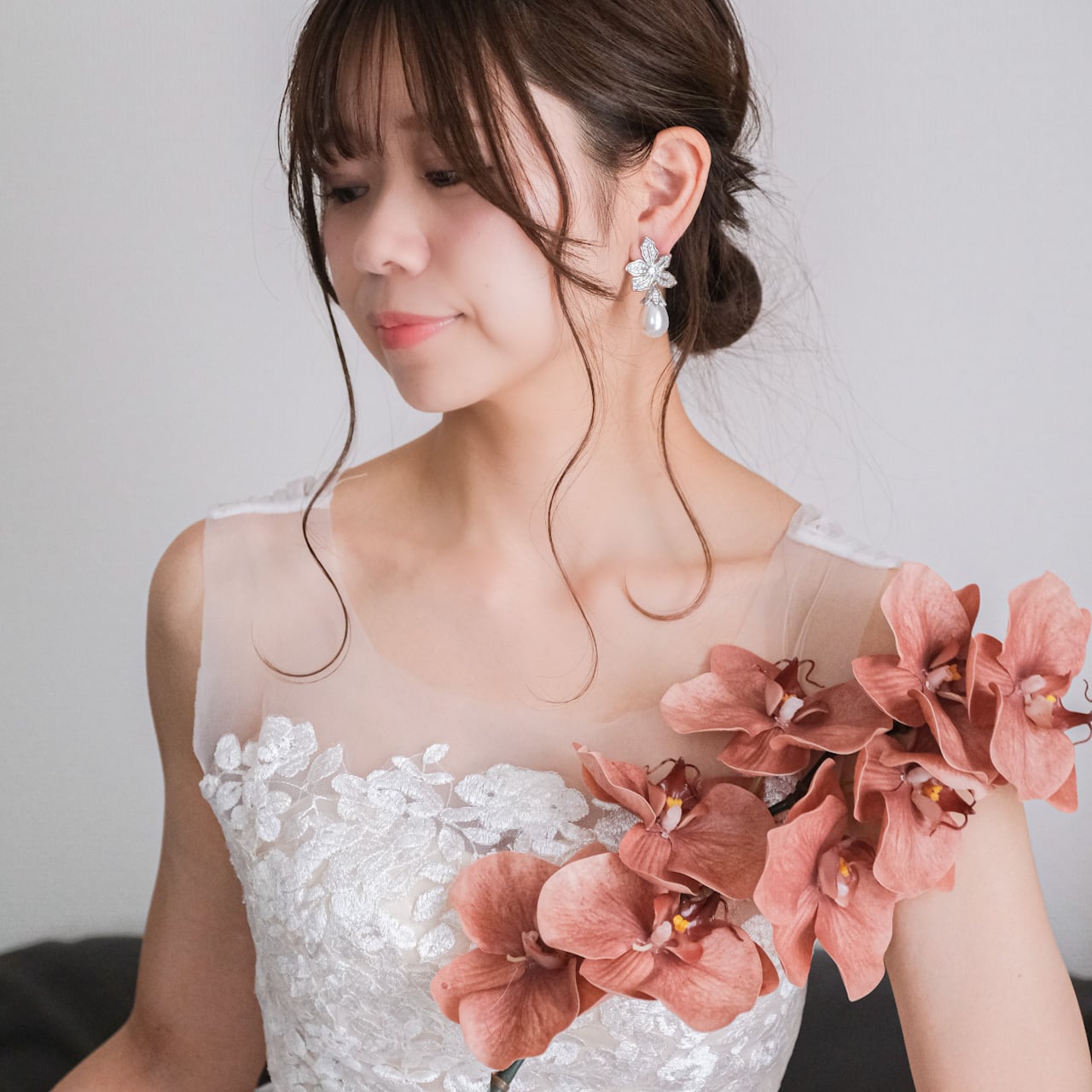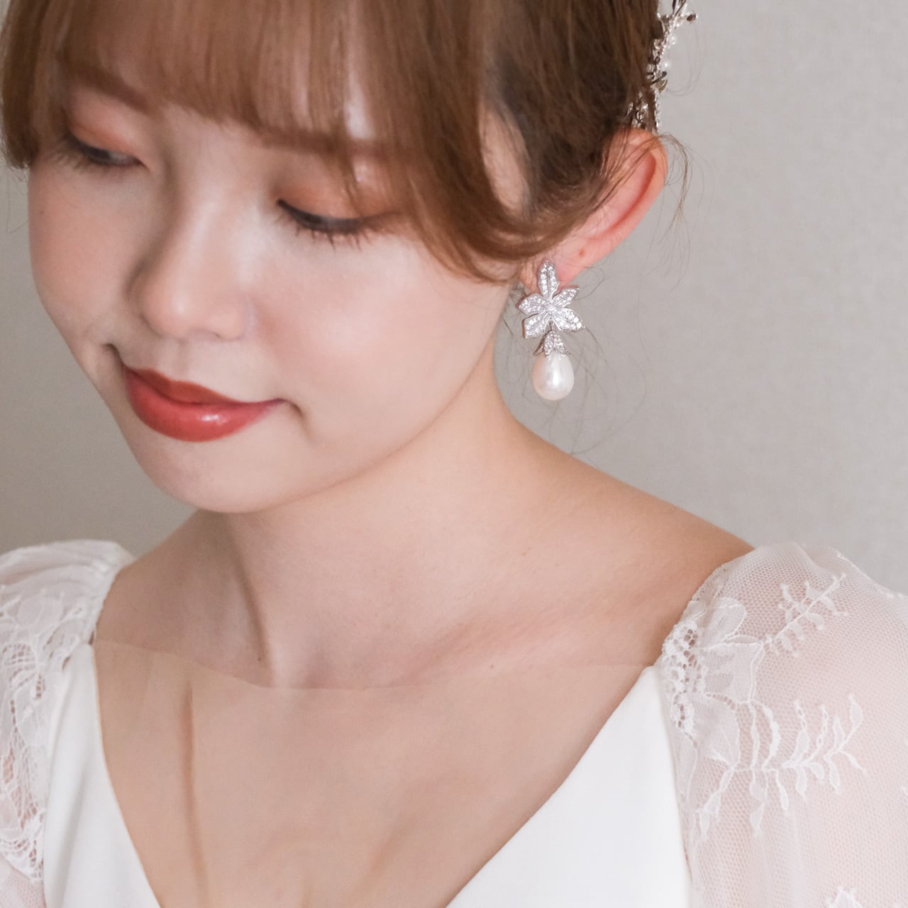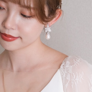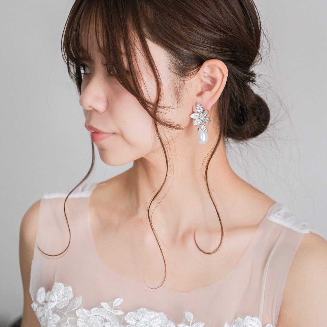 ビジューフラワーとパールの輝きが美しく映える、シルバーのブライダルピアスです。大切な日を迎える花嫁様にふさわしい、エレガントなデザインです。