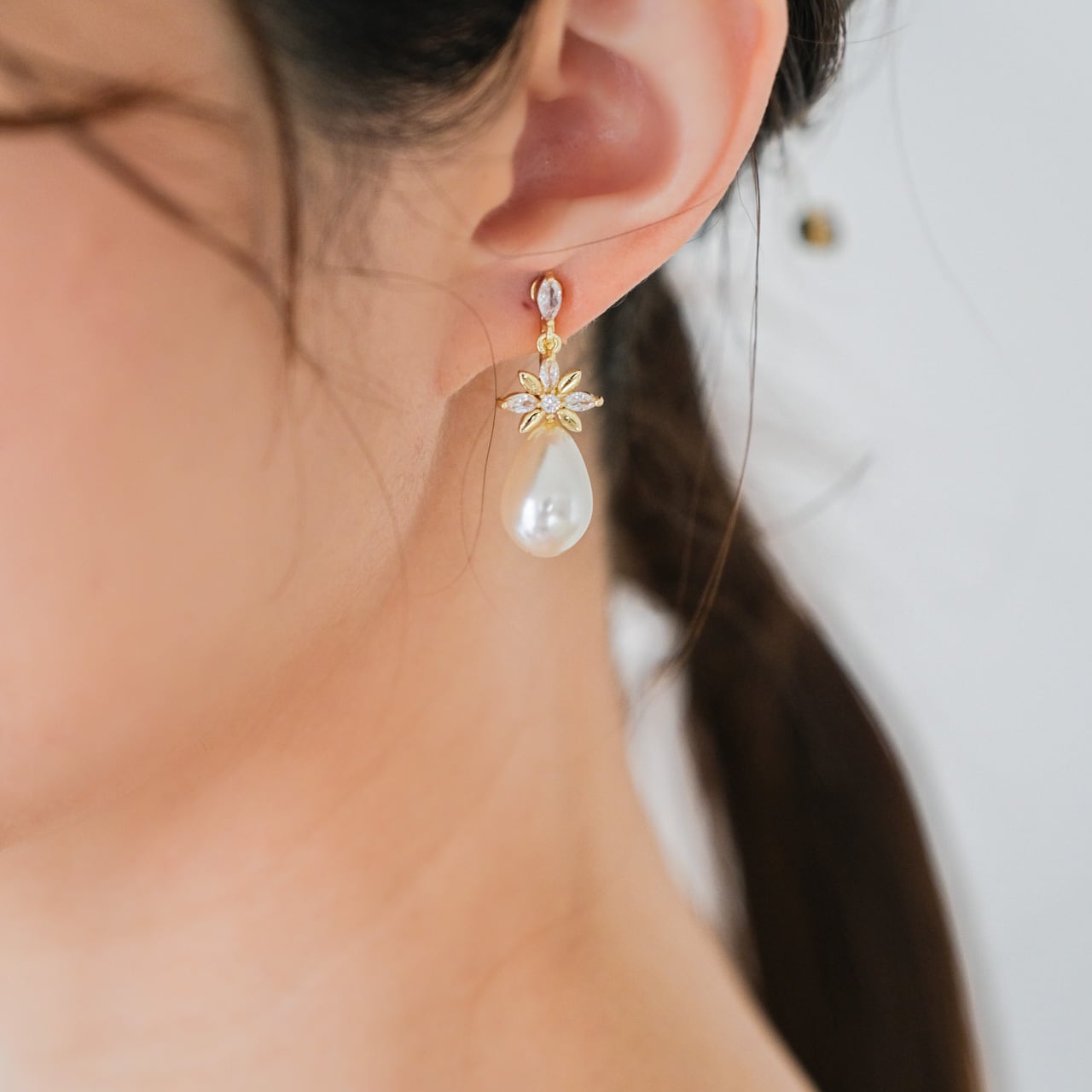 輝くジルコニアとパールの組み合わせが美しいブライダルピアス。