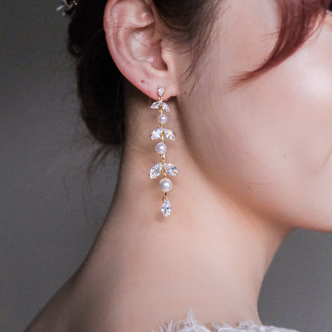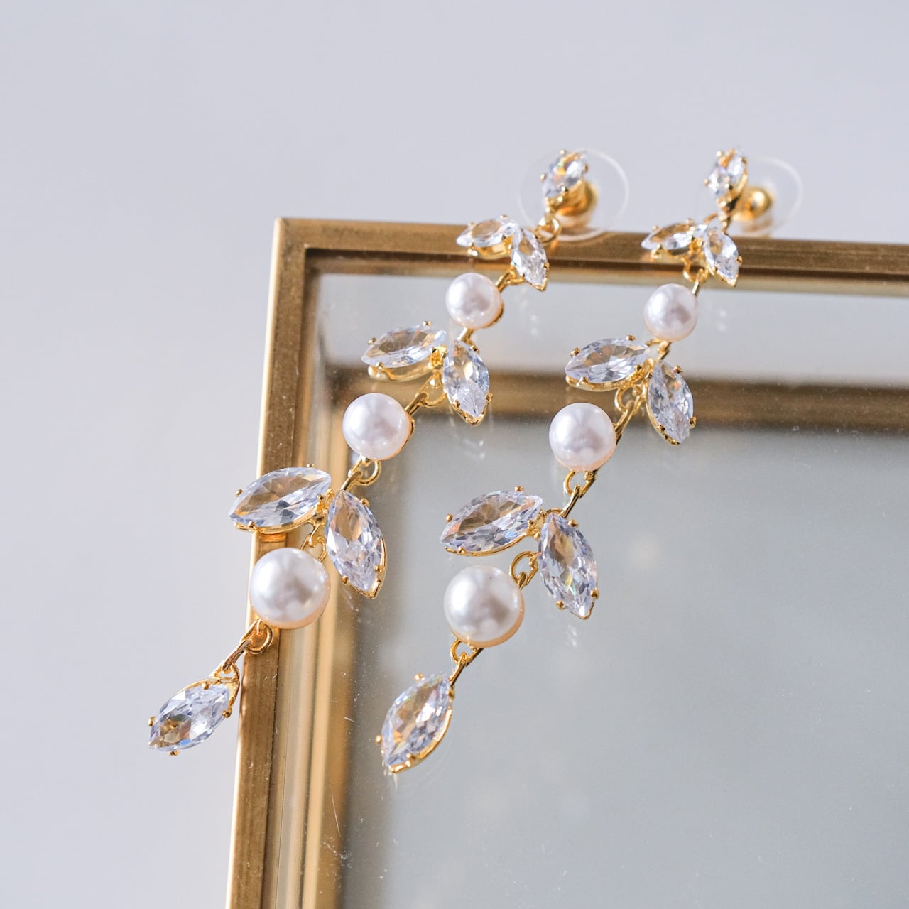 v4-pi56【ピアス】ブライダル ジルコニア パール リーフ ゴールド