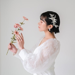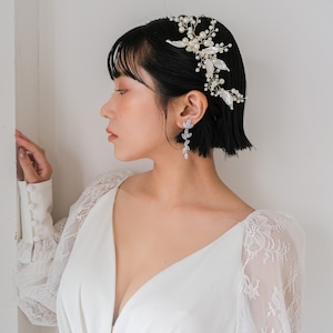 優雅な印象を与える、シルバーカラーの金属リーフと美しいパールが特徴的な一品です。