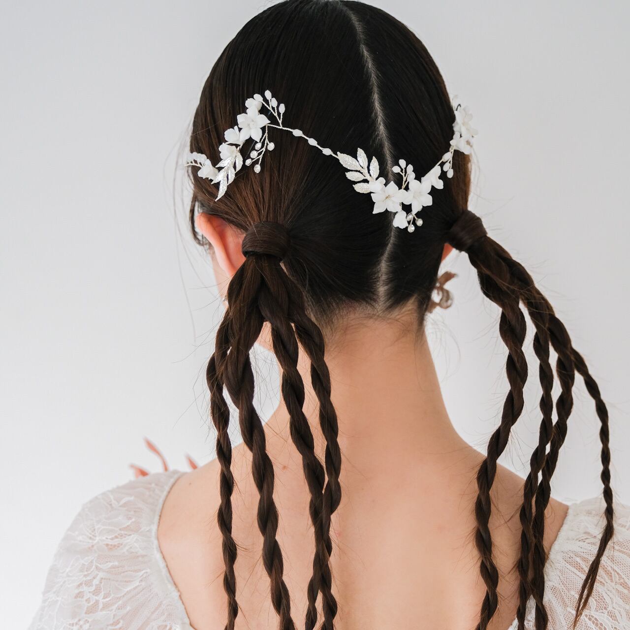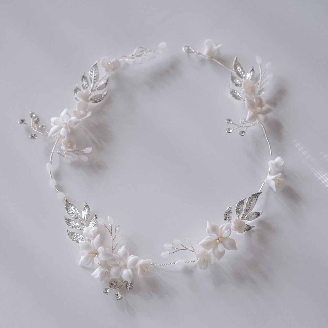 v54-hd111 ブライダルヘッドドレス 小枝カチューシャ ホワイトフラワー シルバー