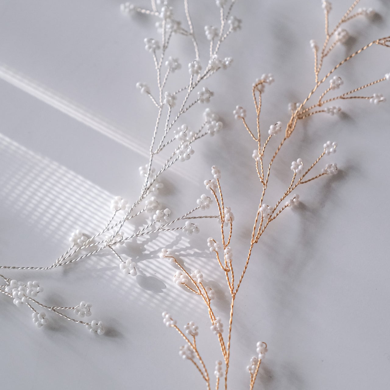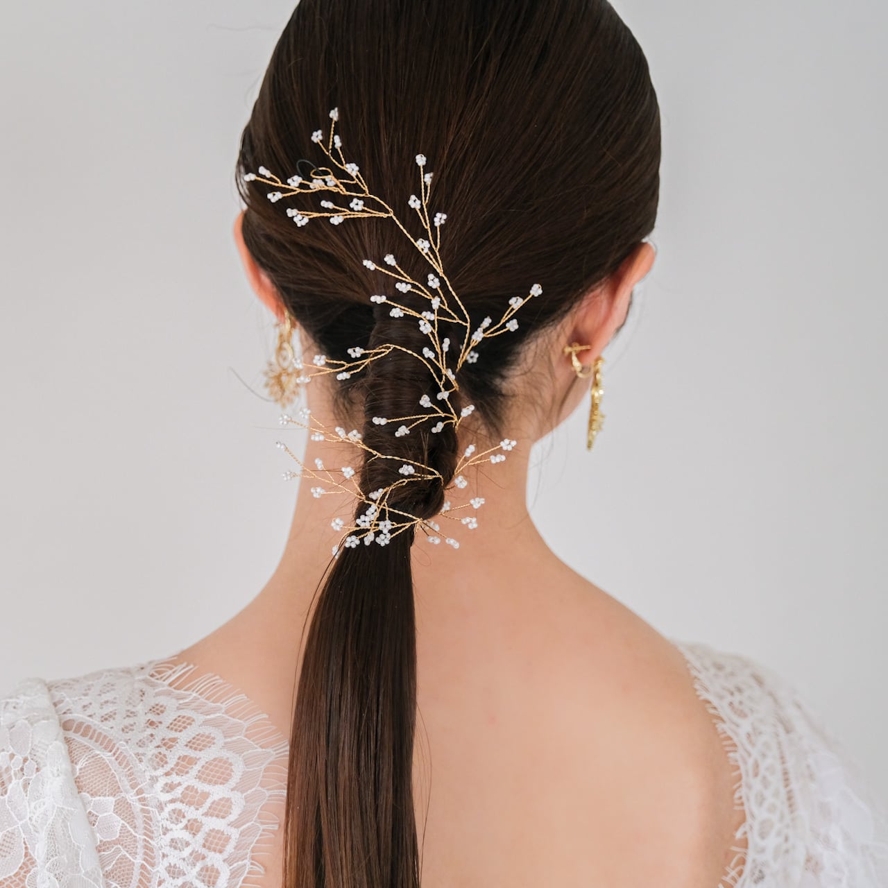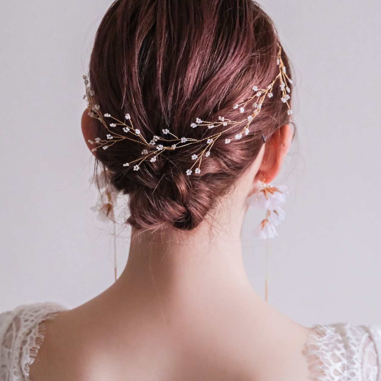 シンプルながらも華やかさを添えてくれる小枝ヘッドドレスは、ヘアアレンジを選ばずに合わせることができます。