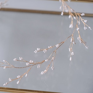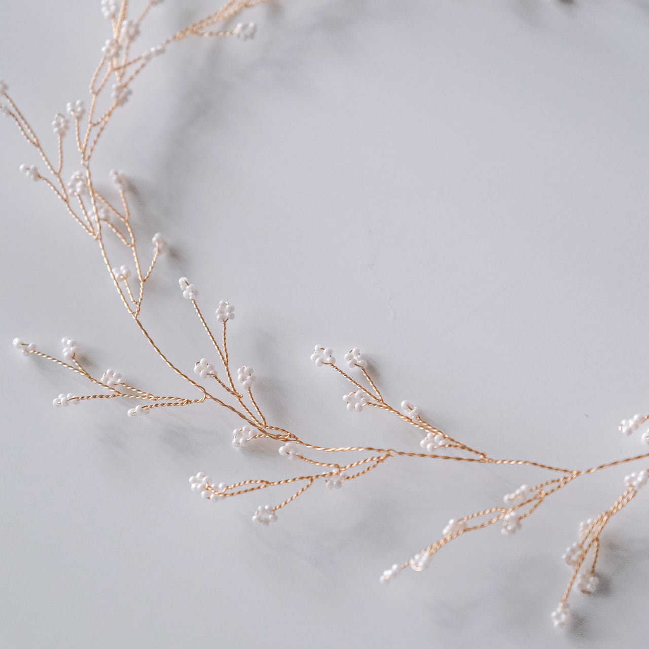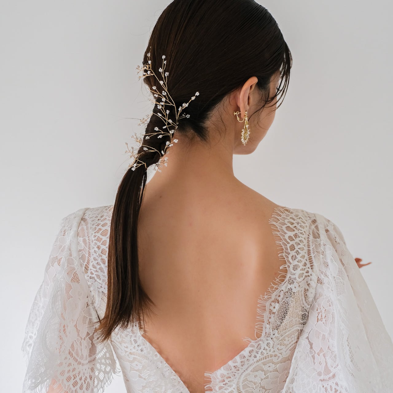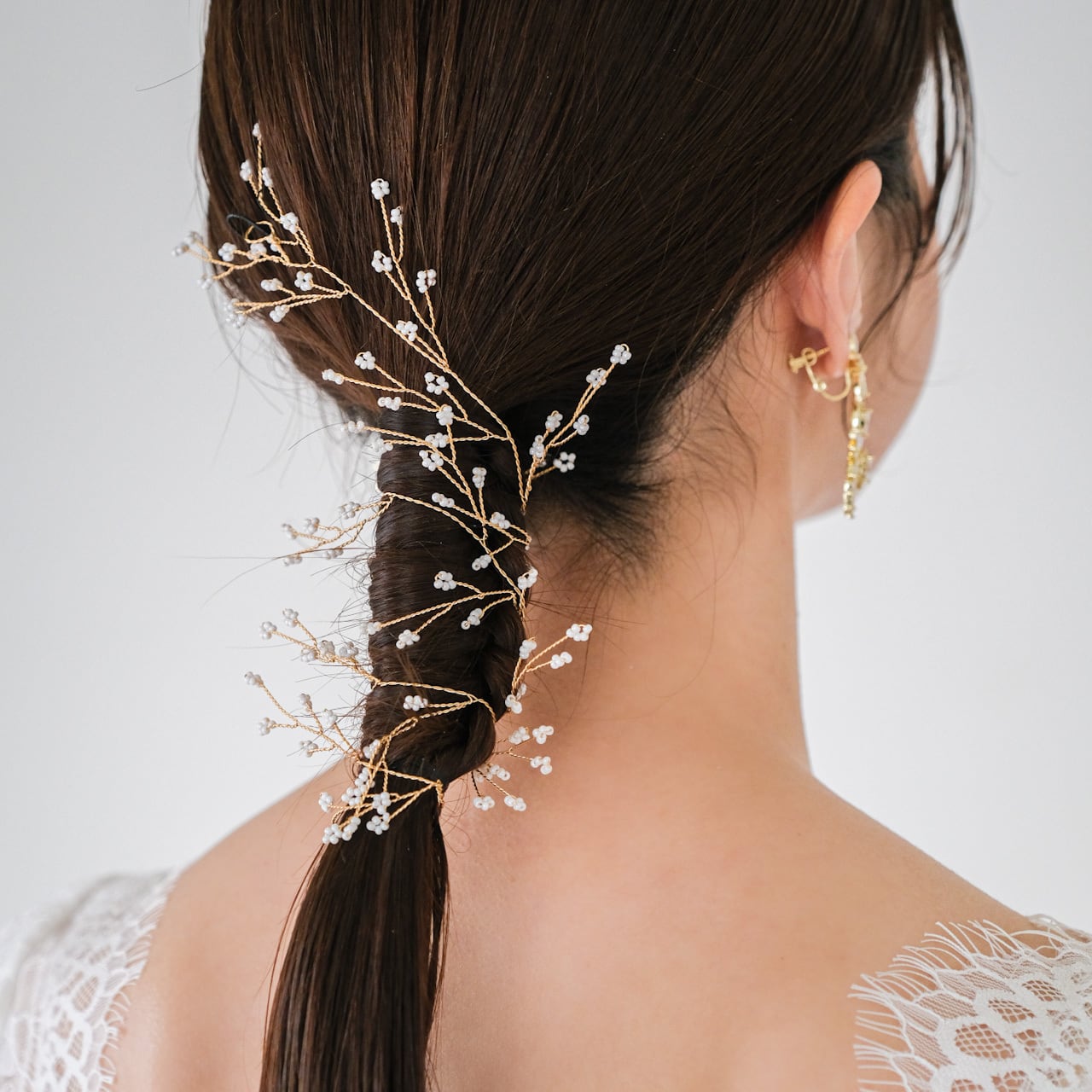 シンプルながらも華やかさを添えてくれる小枝ヘッドドレスは、ヘアアレンジを選ばずに合わせることができます。