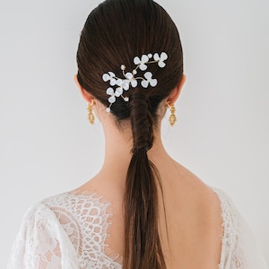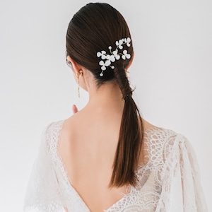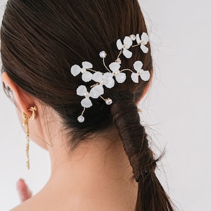 ヘアスタイルによって位置を変えてアレンジも自由自在。カラードレスにも合わせやすく、華やかな一日を演出してくれますよ。
