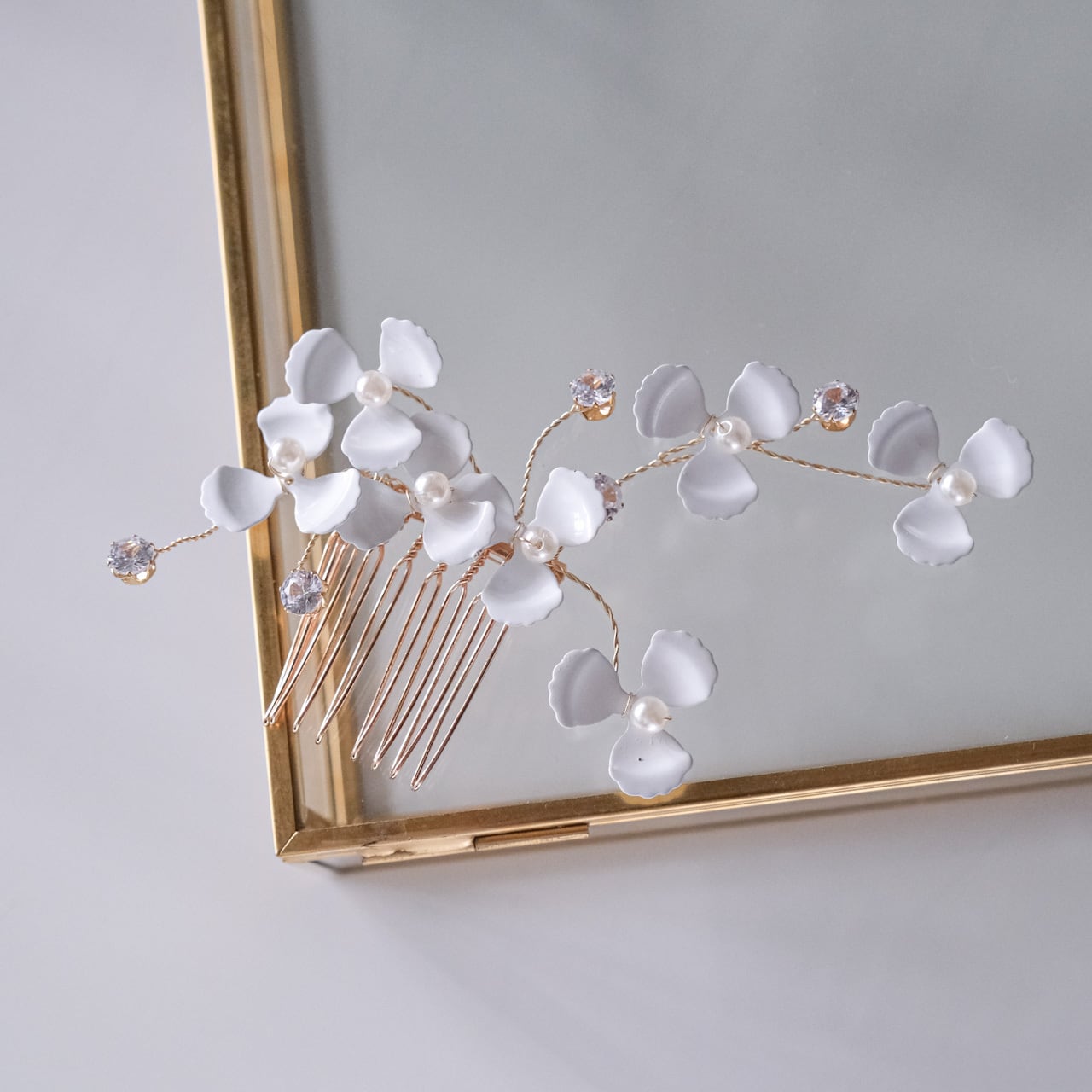 繊細な白い花とパールとビジューが贅沢に散りばめられたヴィンテージ風のヘッドドレスは、まるでおとぎ話の中から出てきたような上品なデザイン。