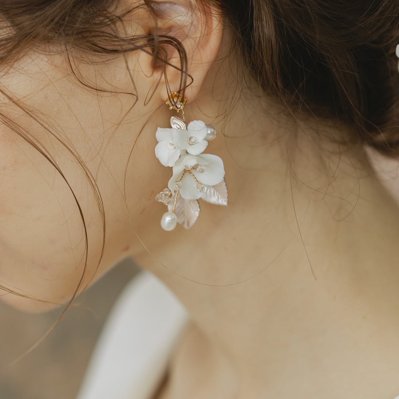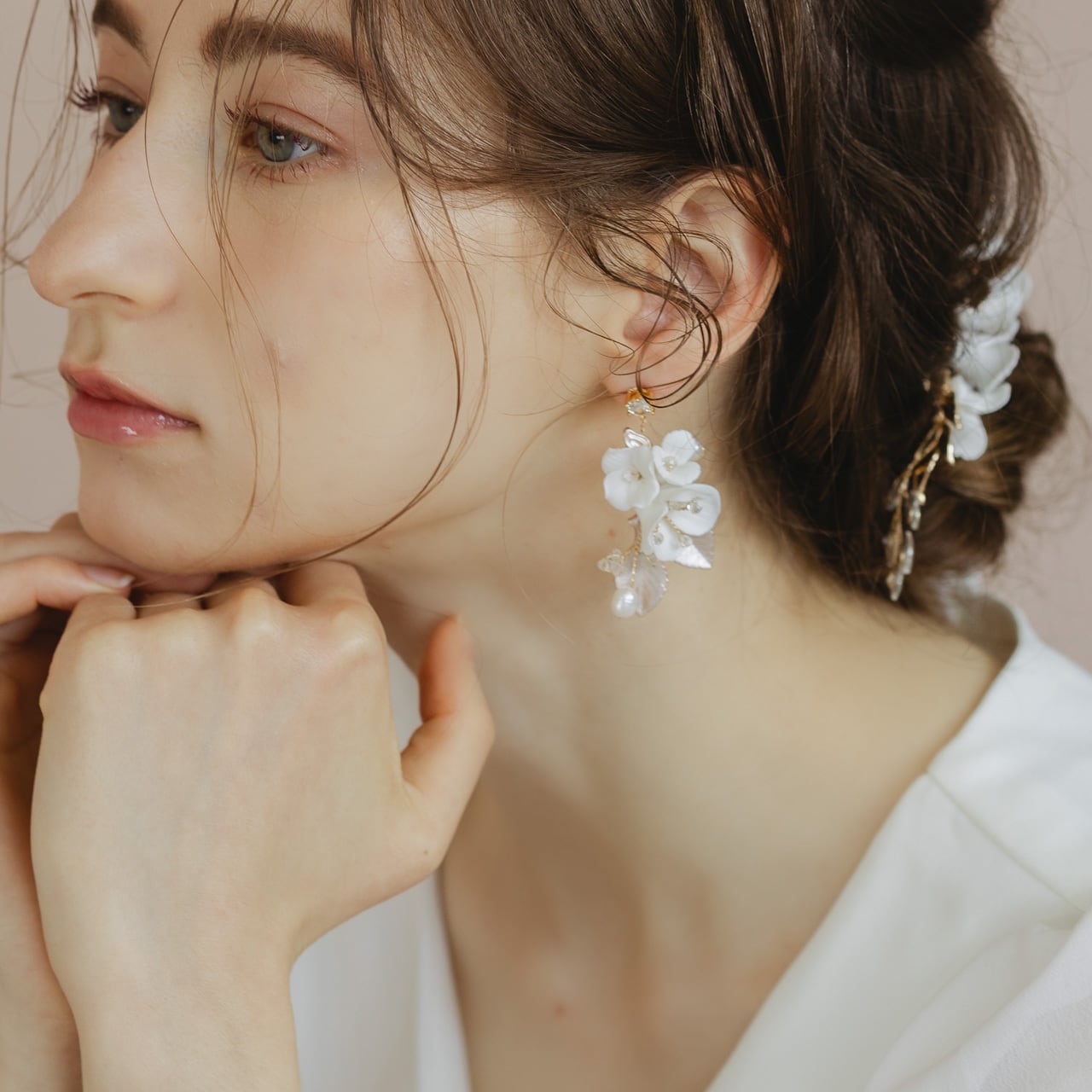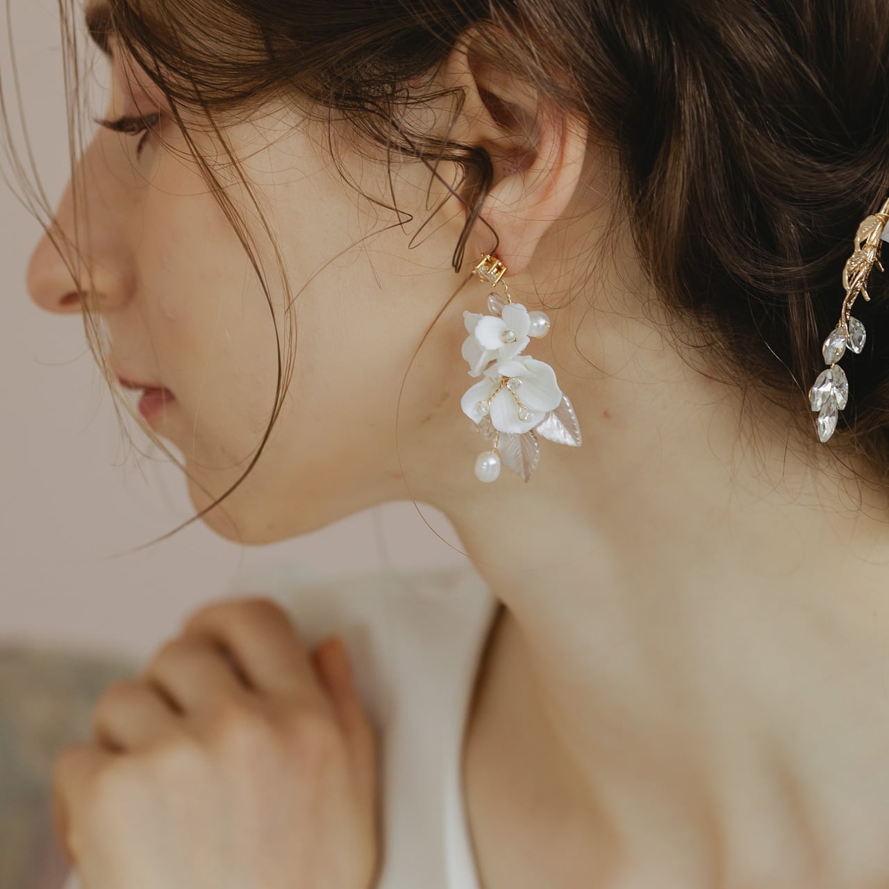 ブライダルにふさわしい、小さな花とビジューが美しく輝く白い花束のような小枝ピアスです。