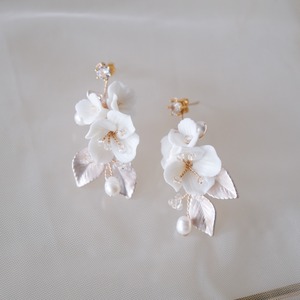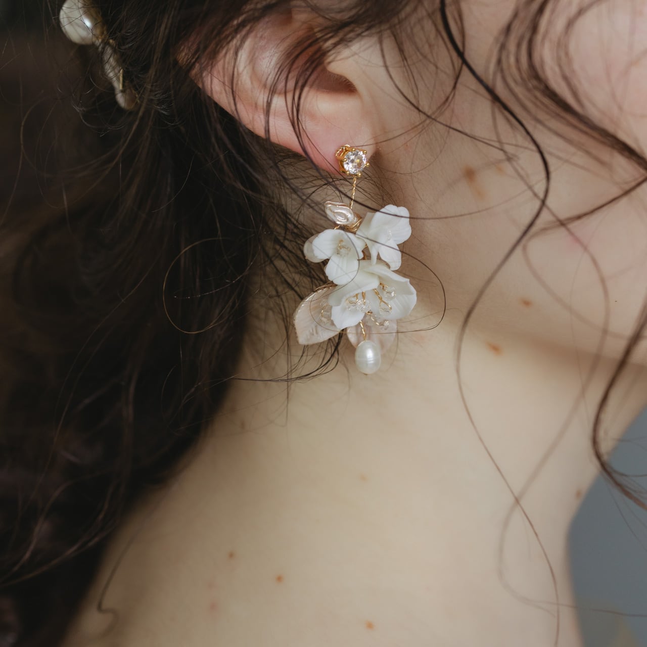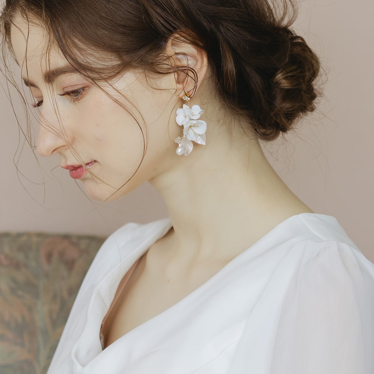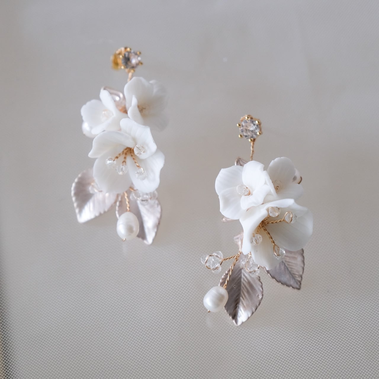ブライダルにふさわしい、小さな花とビジューが美しく輝く白い花束のような小枝ピアスです。