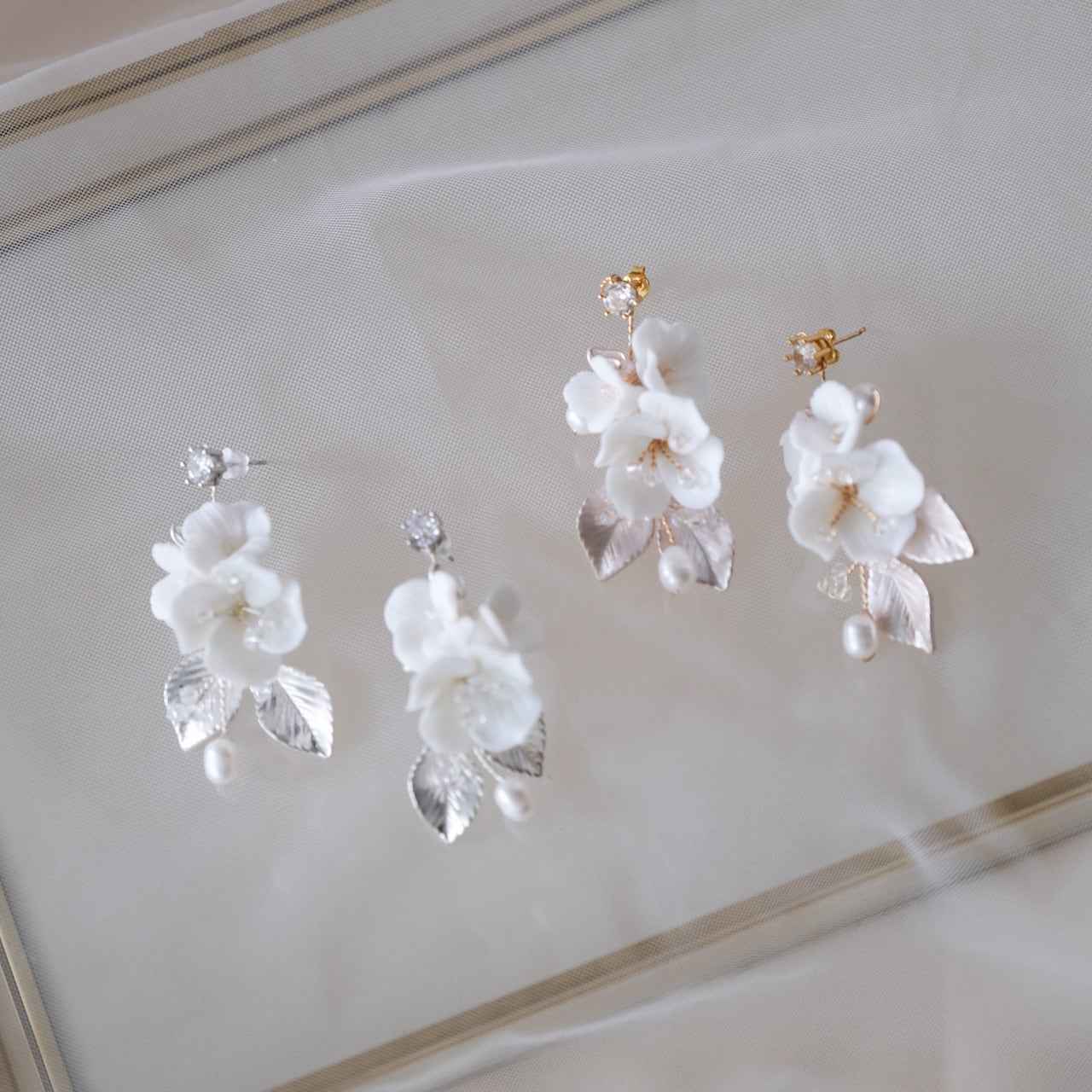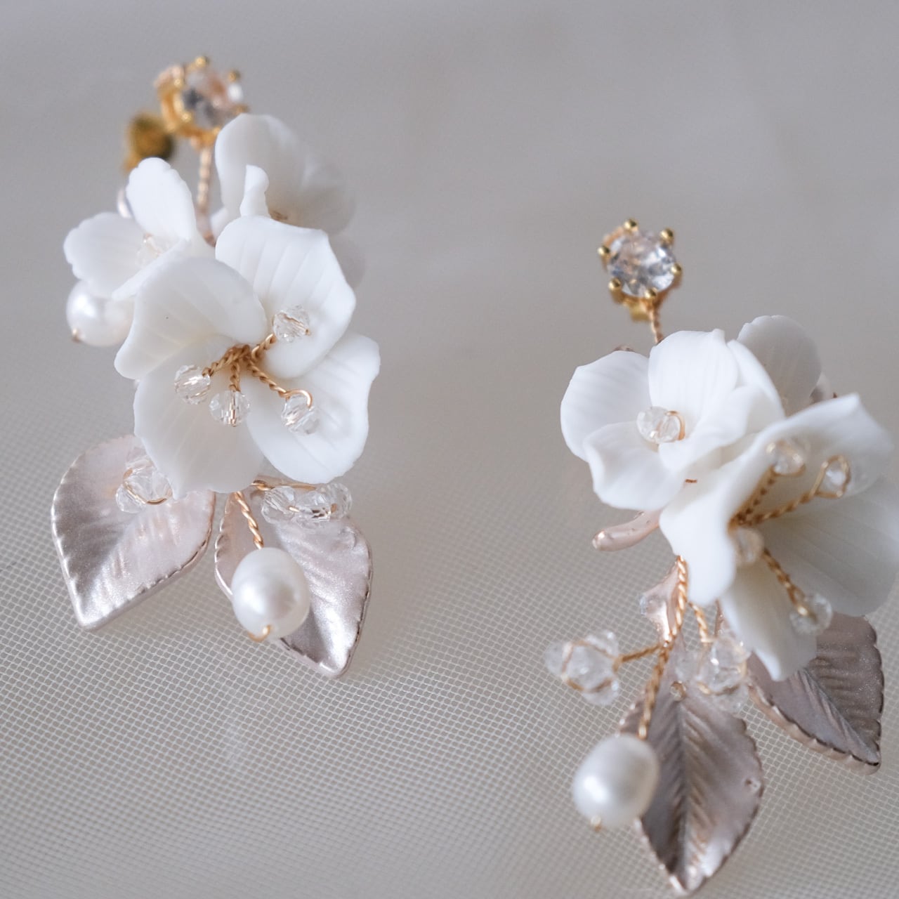 お届けする商品には、その職人の想いが込められています。 『幸せなひと時を彩る』。そんな願いを込めさせていただいた、ブライダル小枝ピアスです。
