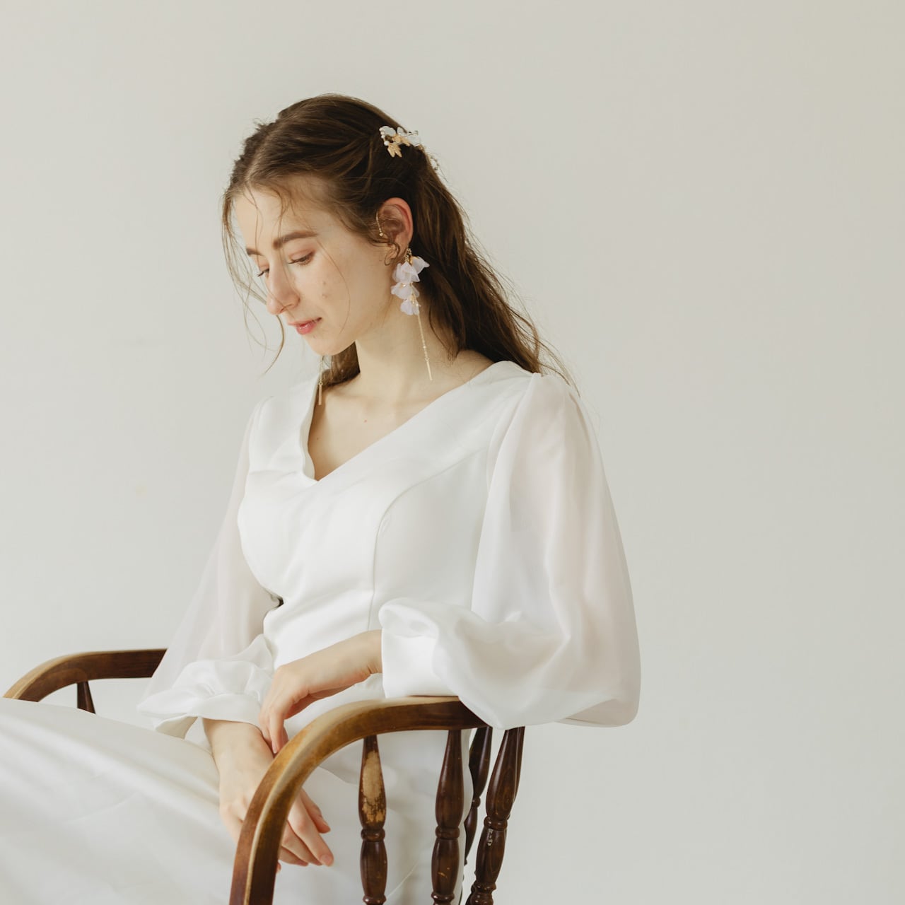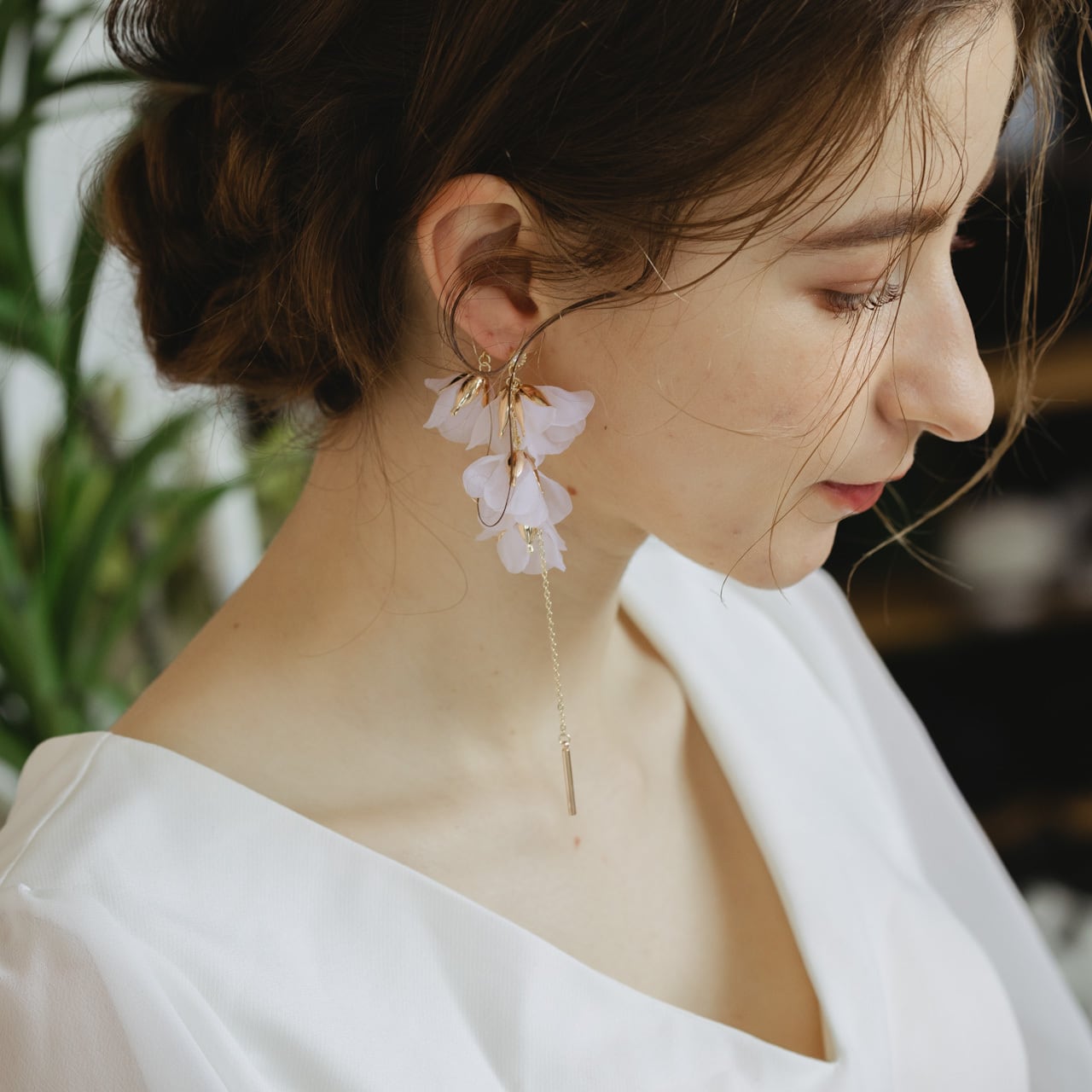 ホワイトフラワーが繊細で、耳元を美しく彩ります。