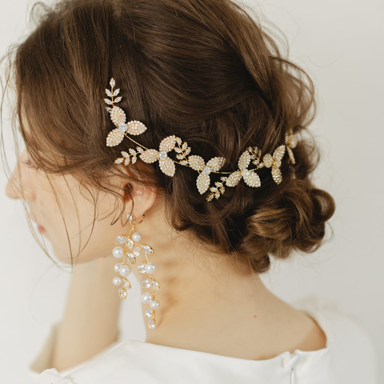 w18-hd126 ブライダルヘッドドレス ビジュー ジルコニア フラワーリーフ ゴールド