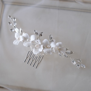 ホワイトフラワーとパールビーズが織り成す上品なデザインが特長です。
