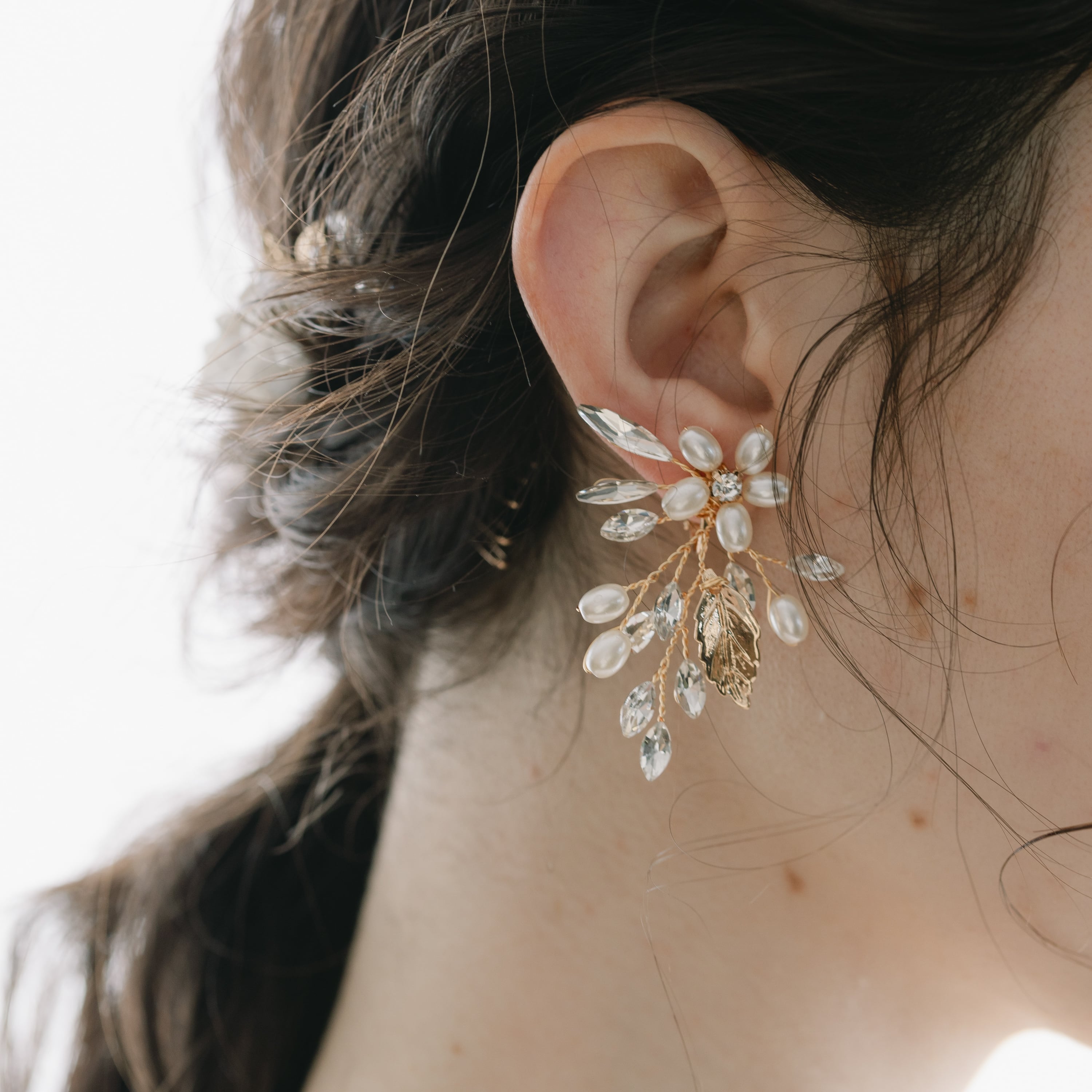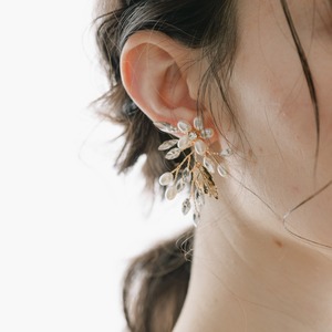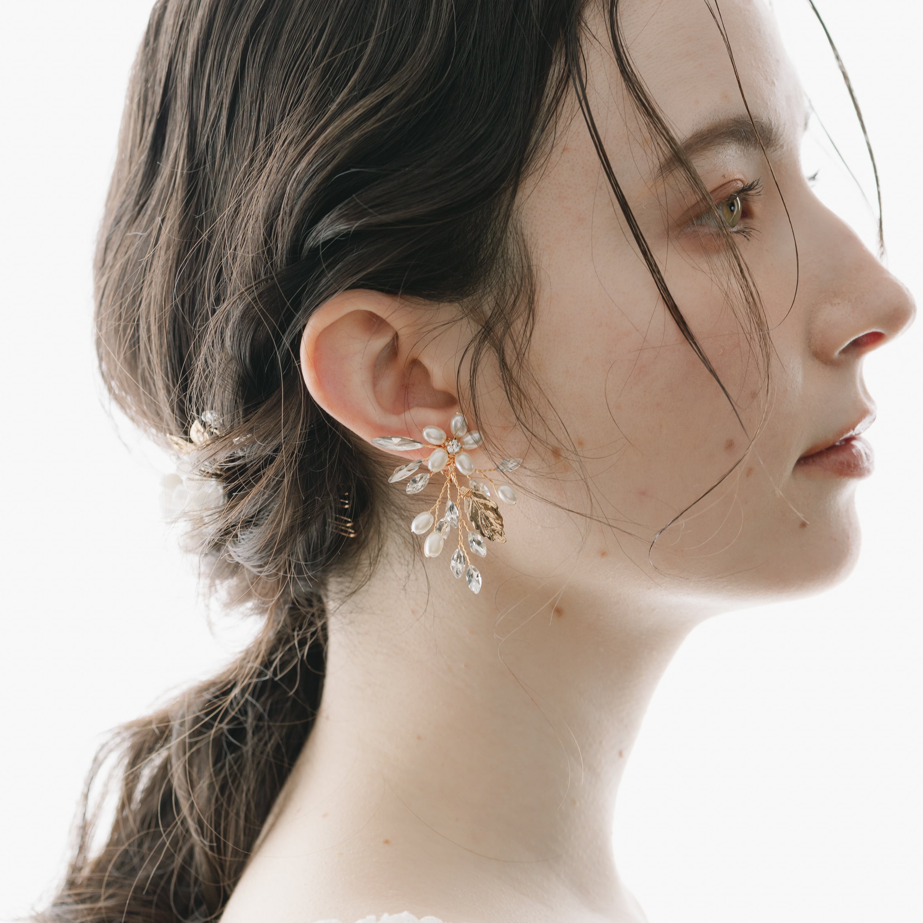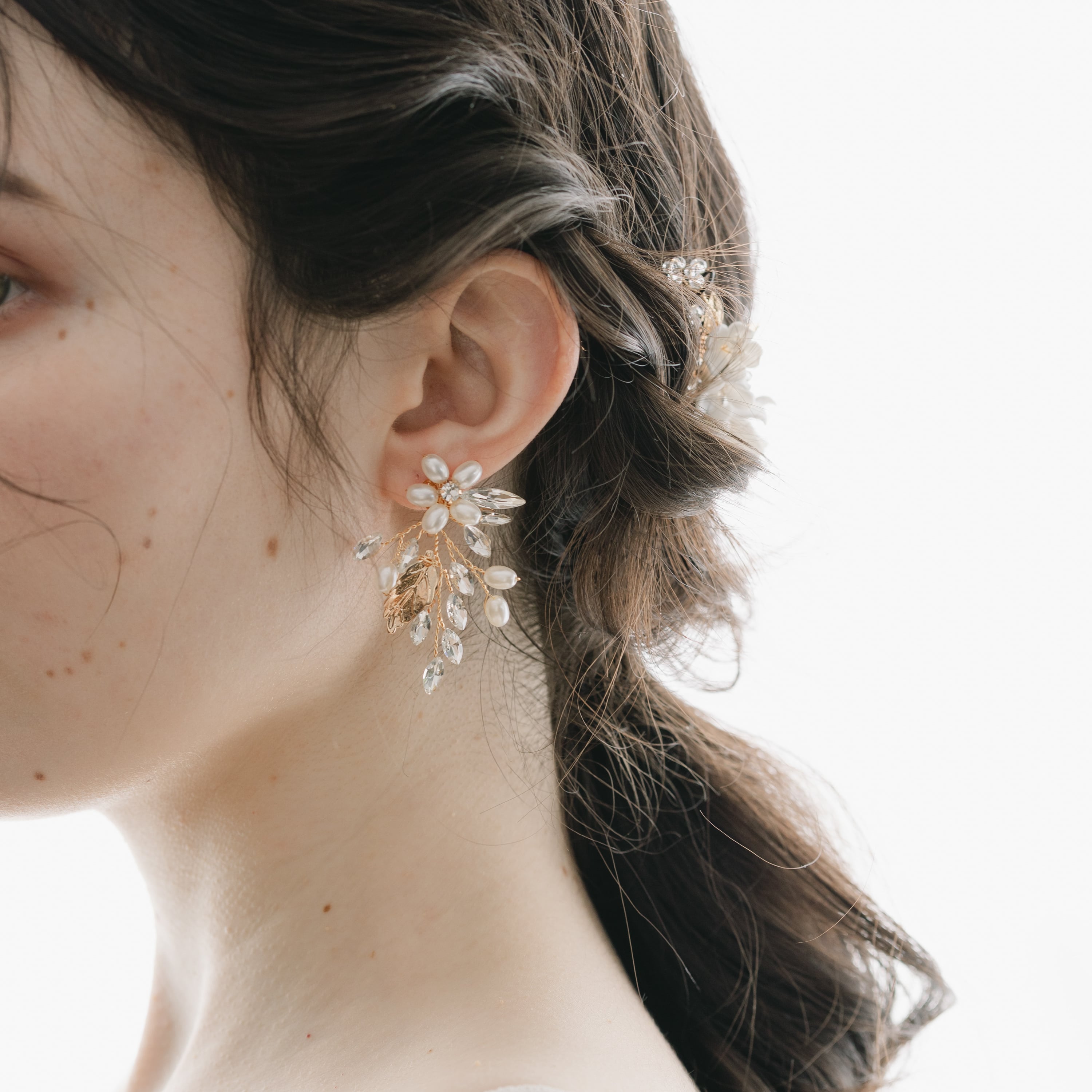 パールビーズで作られた花が耳元でさりげなく輝き、