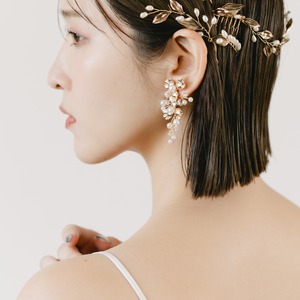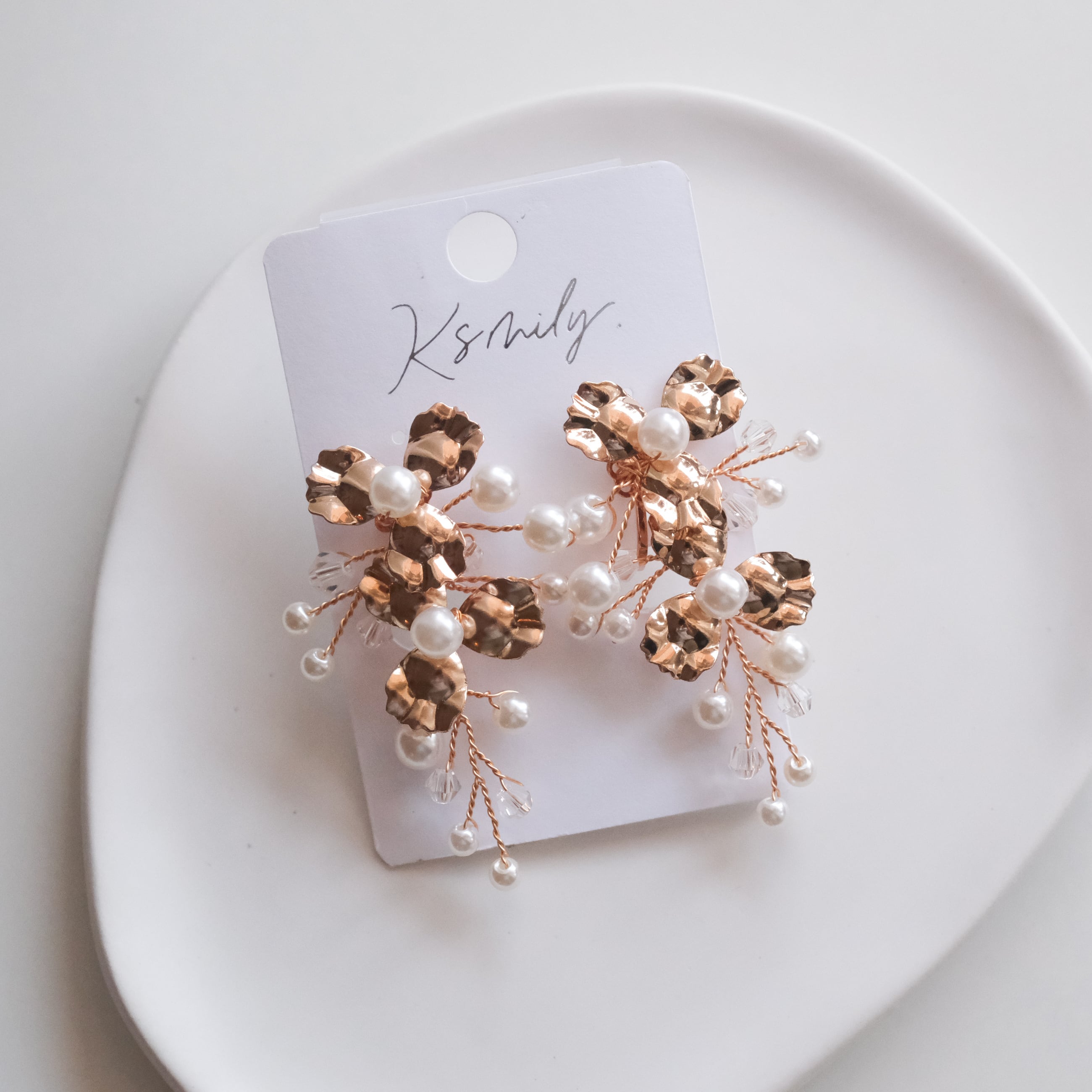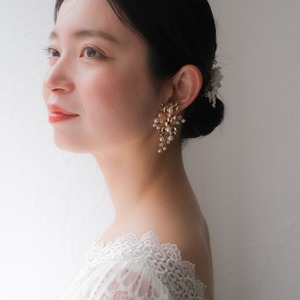x7-pe136【ピアス /イヤリング】アンティーク風フラワー パール 小枝 ブライダル ゴールド